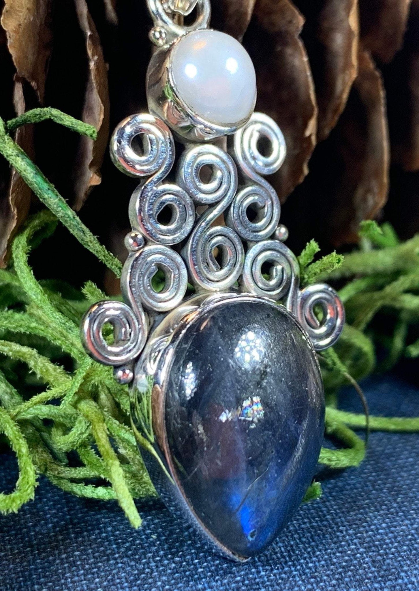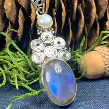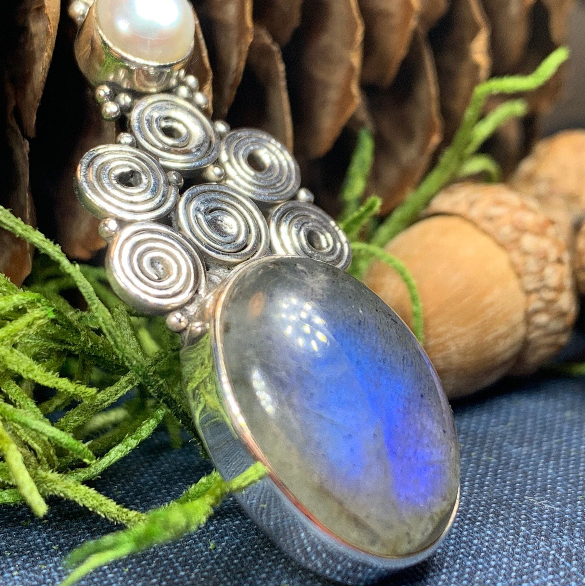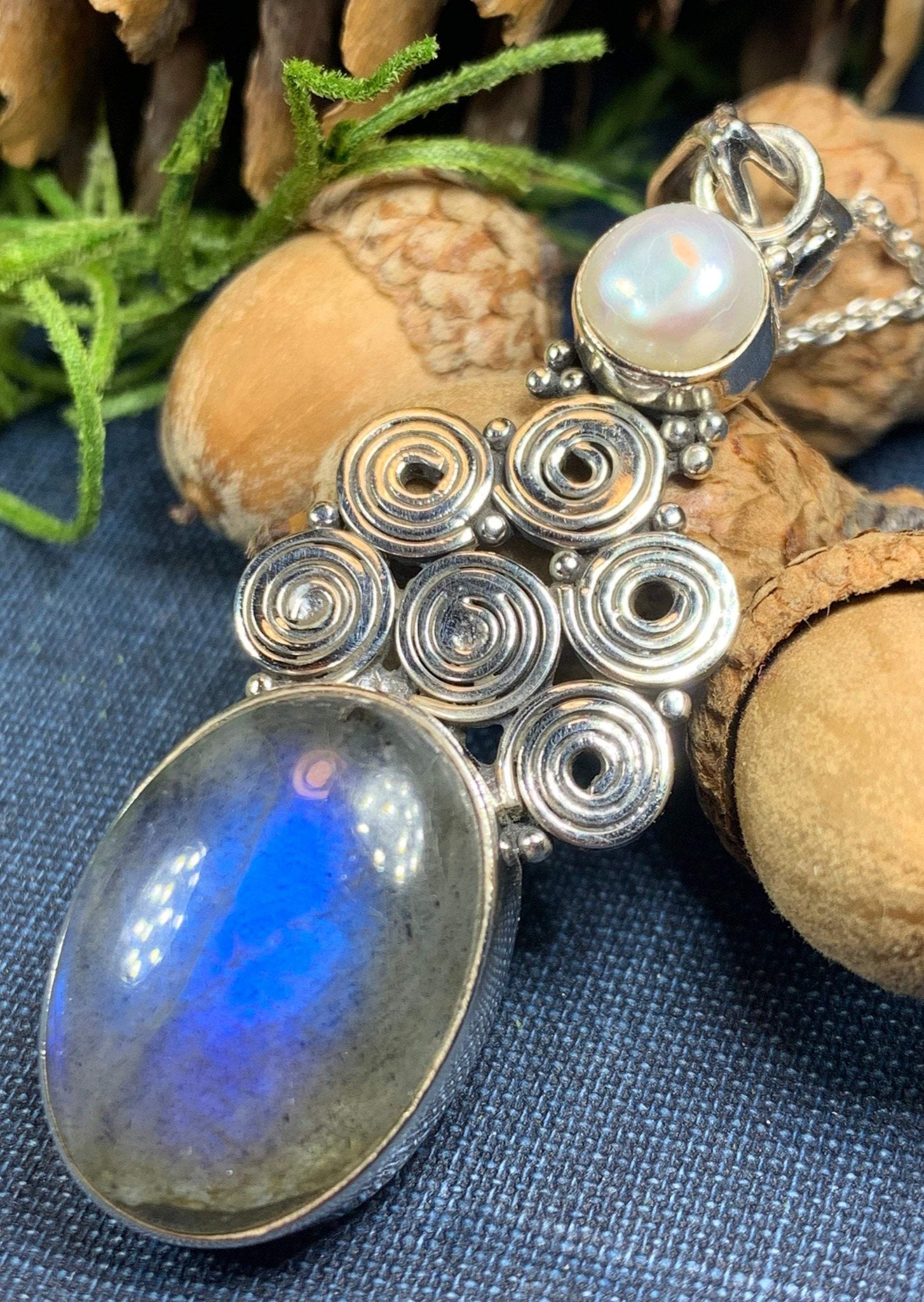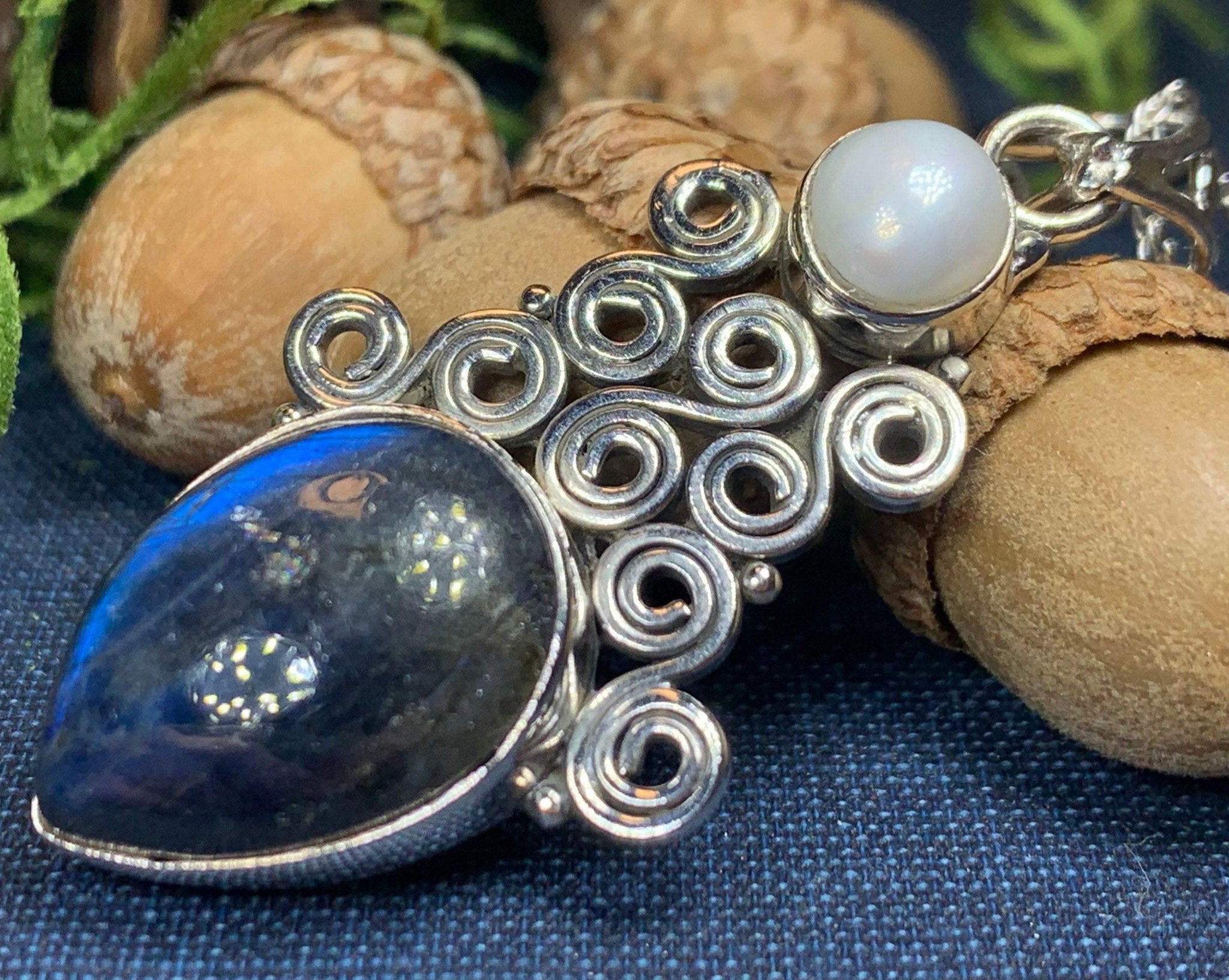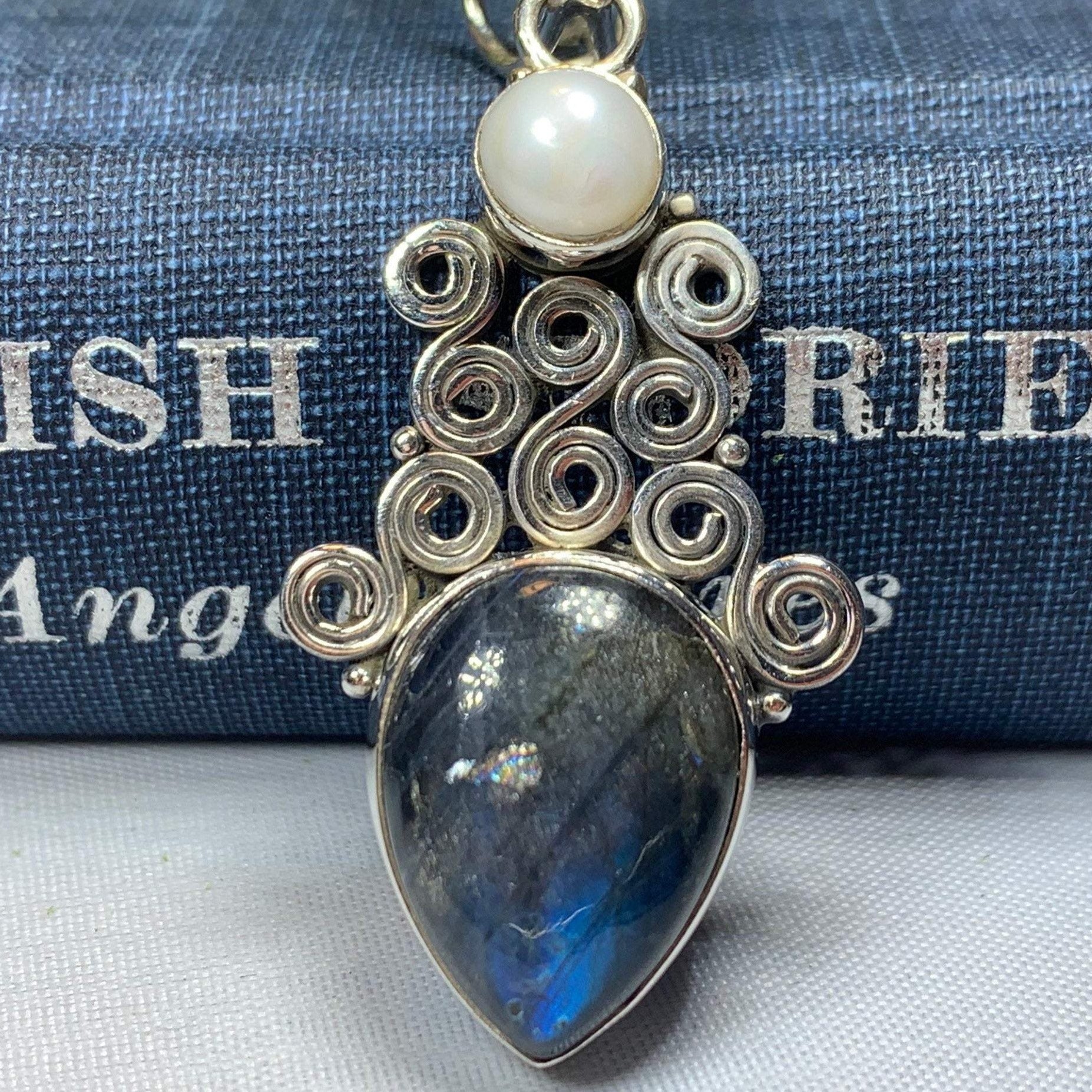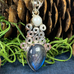 This Solid Sterling Silver Labradorite pendant has a high quality stone with amazing flashing color! The blue fire Labradorite glows with purple, blue, green and gold topped with Celtic inspired spiral and a freshwater pearl - a magical stone that is sure to delight your loved one!