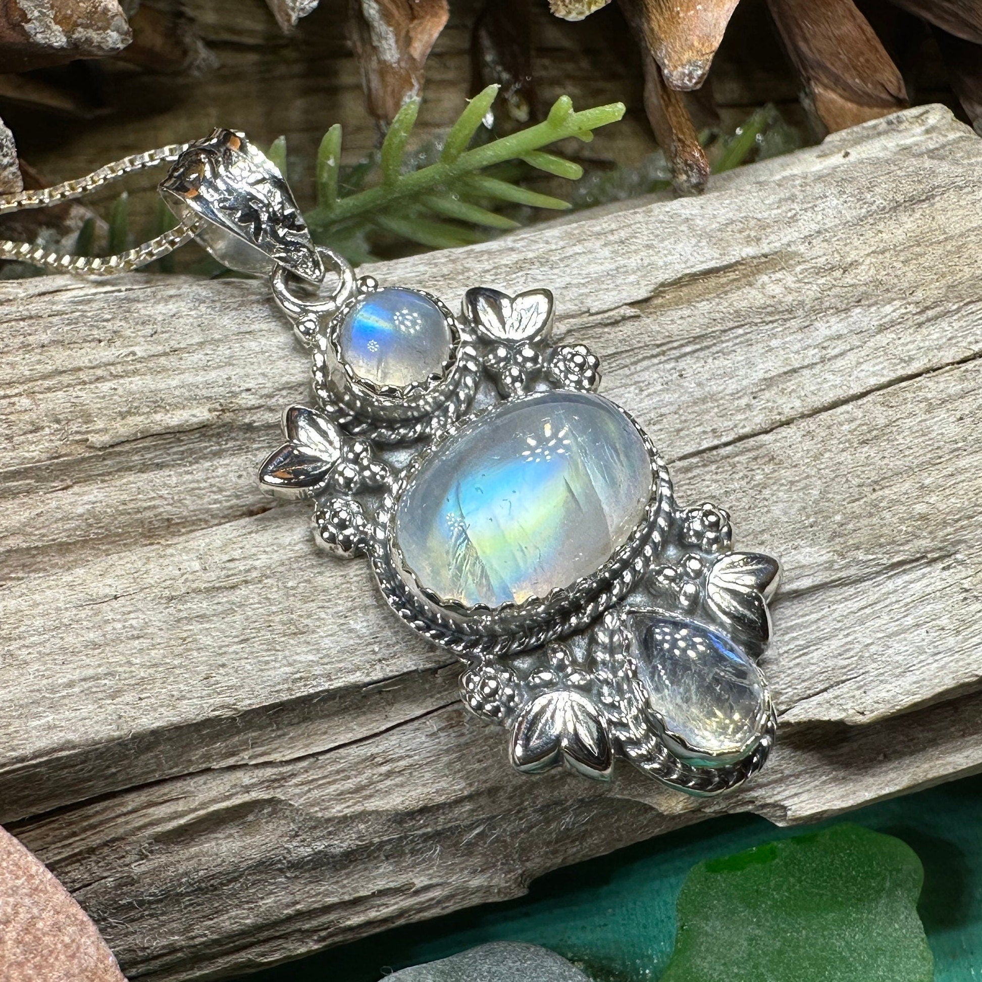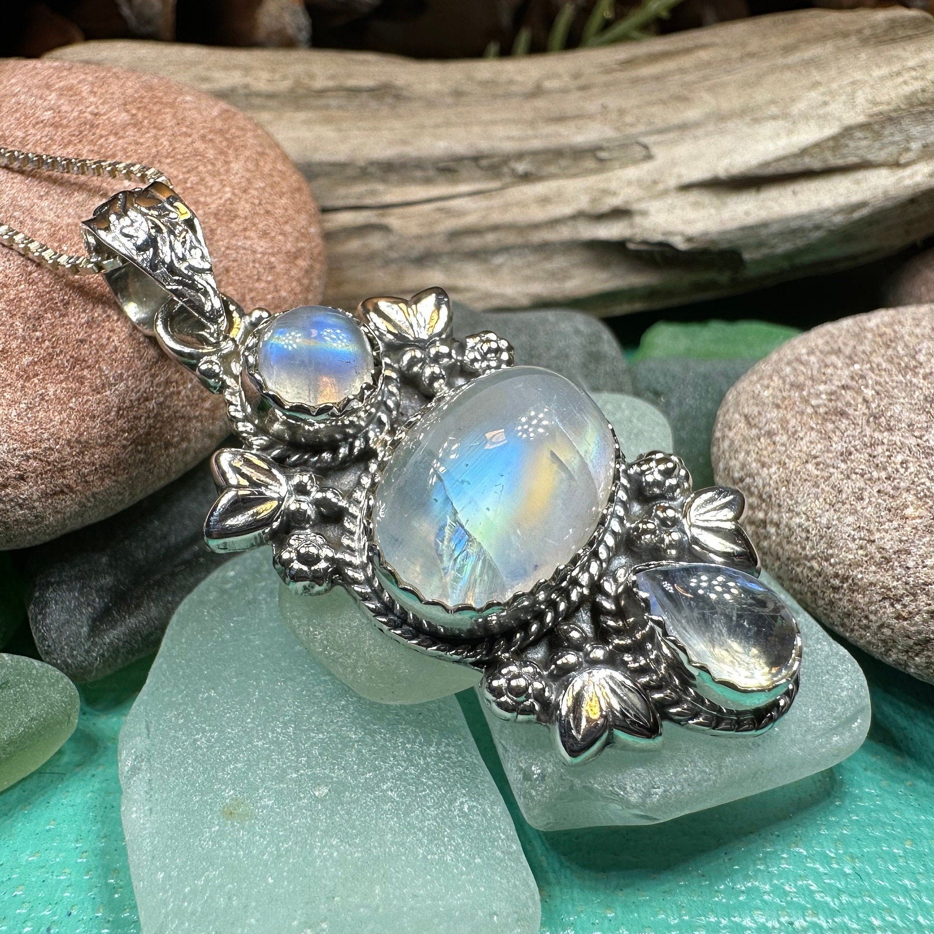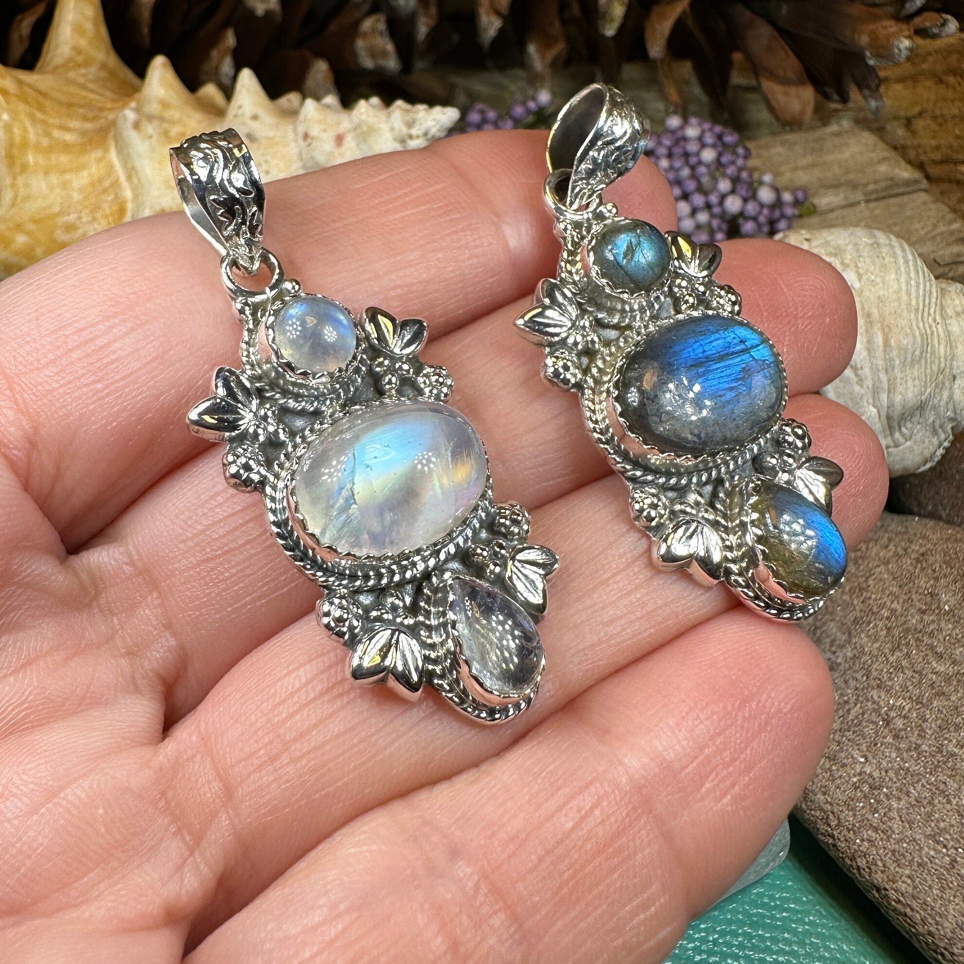 Meticulously handcrafted from fine sterling silver with beautiful detailing. Your choice of rainbow moonstone or cabochon labradorite.