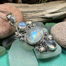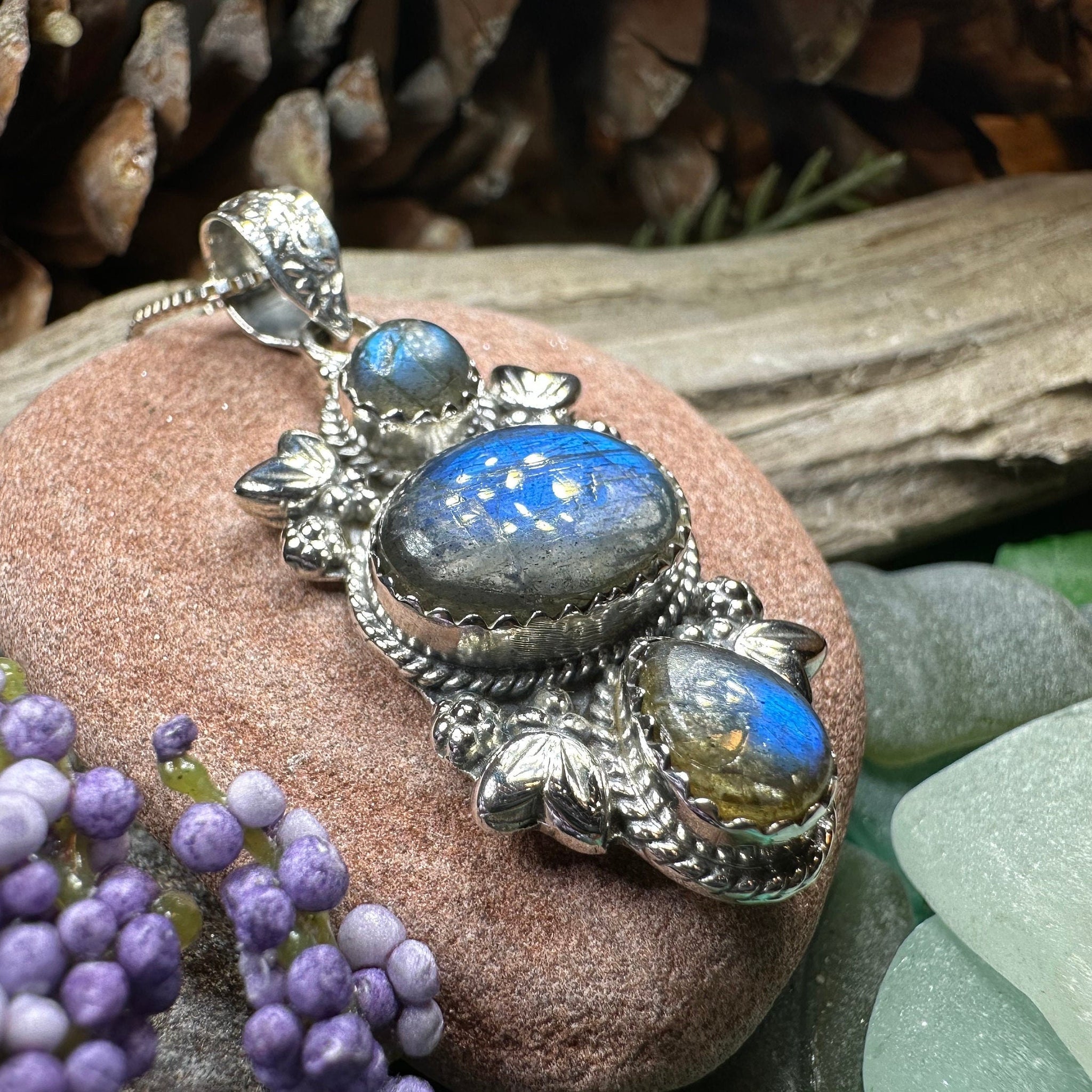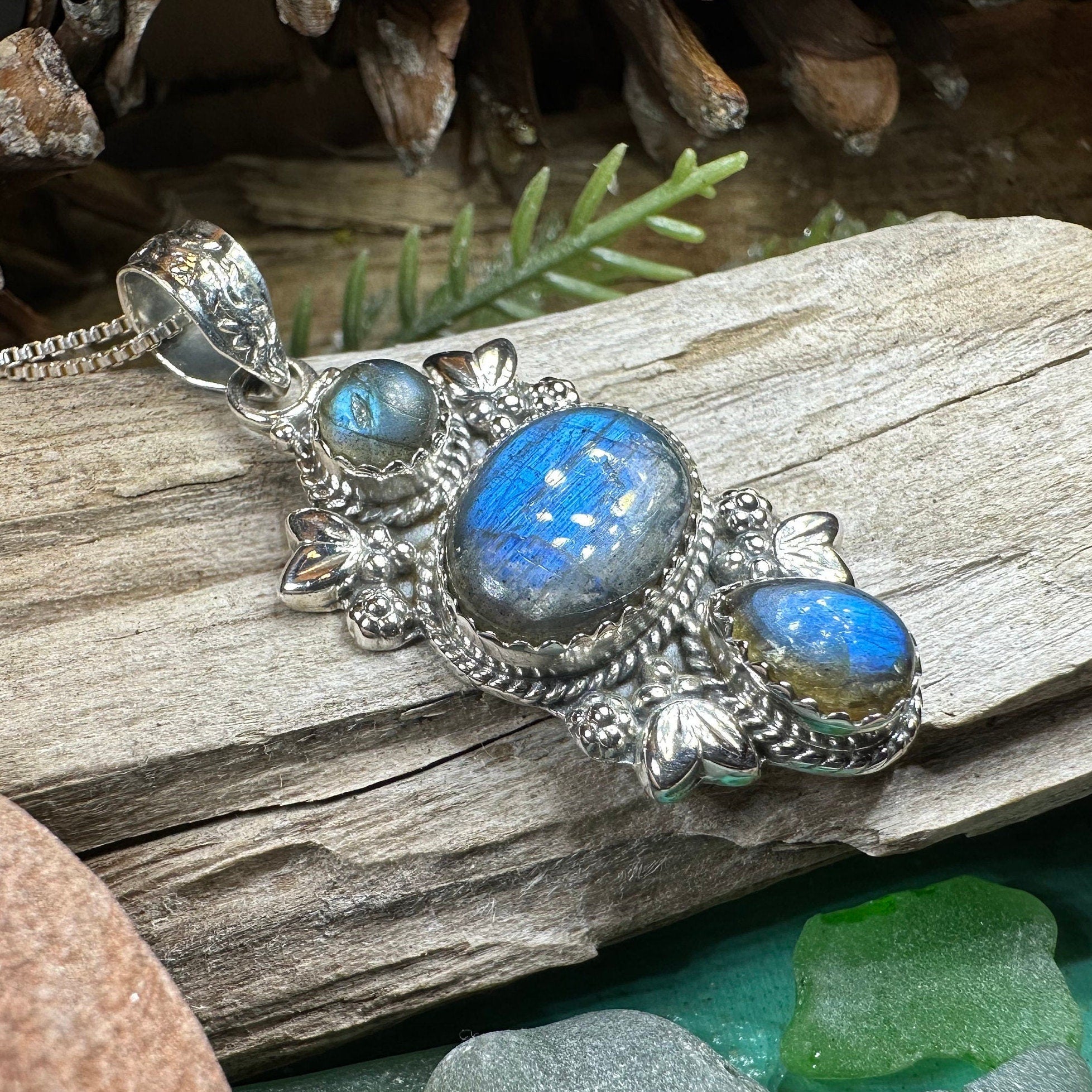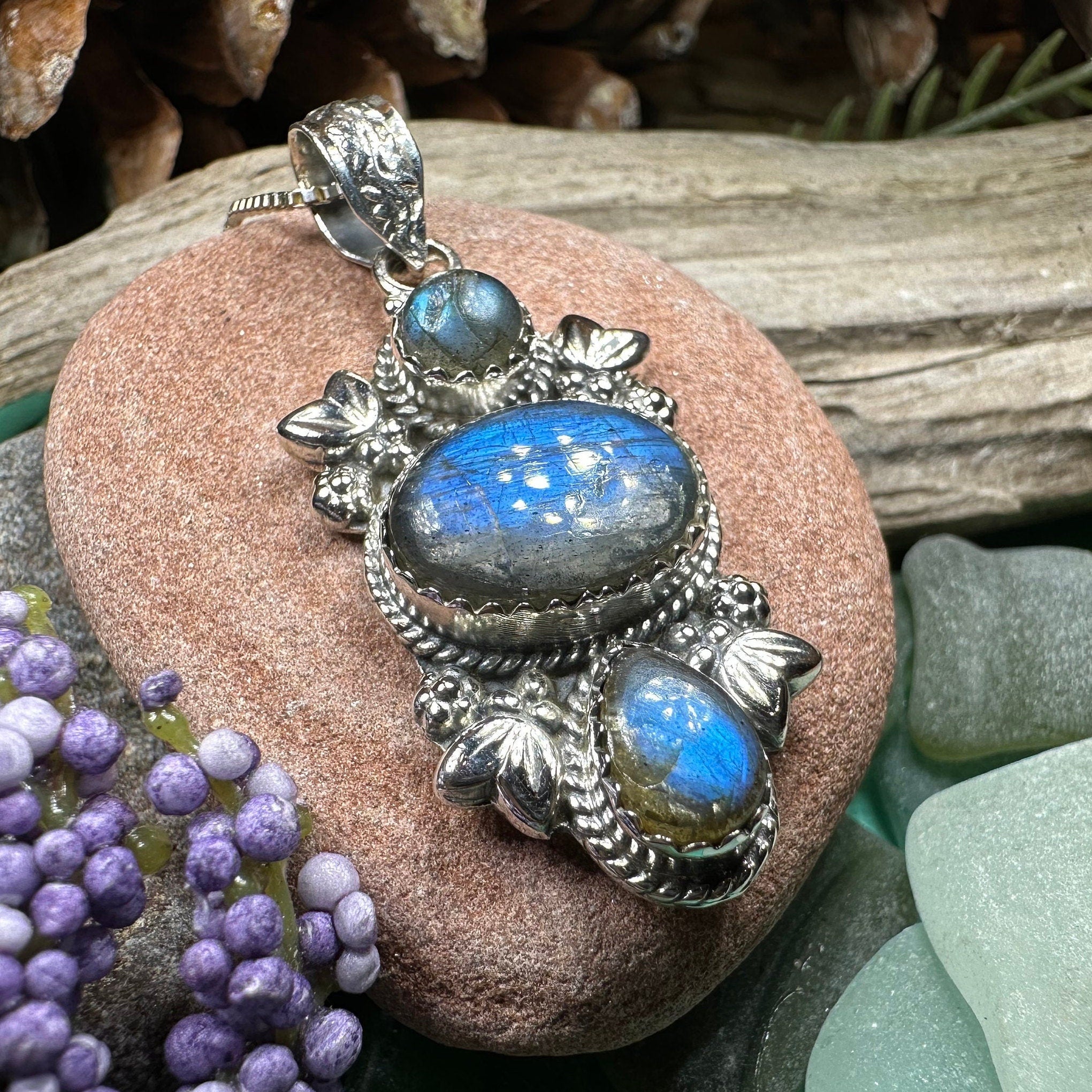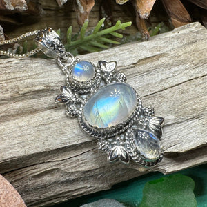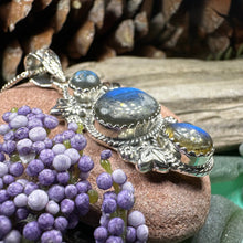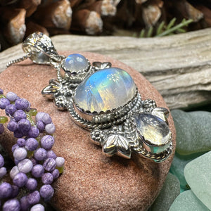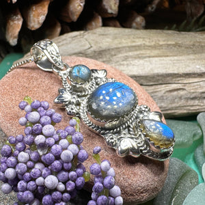This Solid Sterling Silver Gemstone pendant is adorned with a 4 carat cabochon labradorite gemstones arranged in an elegant Celtic inspired design.