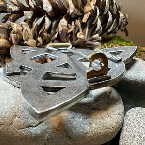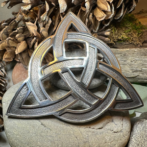 Elevate your style with our stunning Large Celtic Triquetra Tartan Pin, featuring intricate Celtic knotwork that will surely captivate attention when adorned on a kilt, plaid, sweater, jacket, or coat.