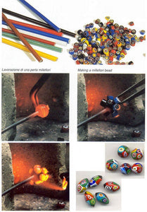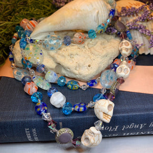 Beautiful summer sunset colors of pale blue and Cobalt blue with touches of orange and purple - making this a perfect piece to match with any outfit. Venetian Millefiori beads, Czech pressed glass beads, crystal seed beads, and six cream howlite skulls give this necklace a fun and flirty look!