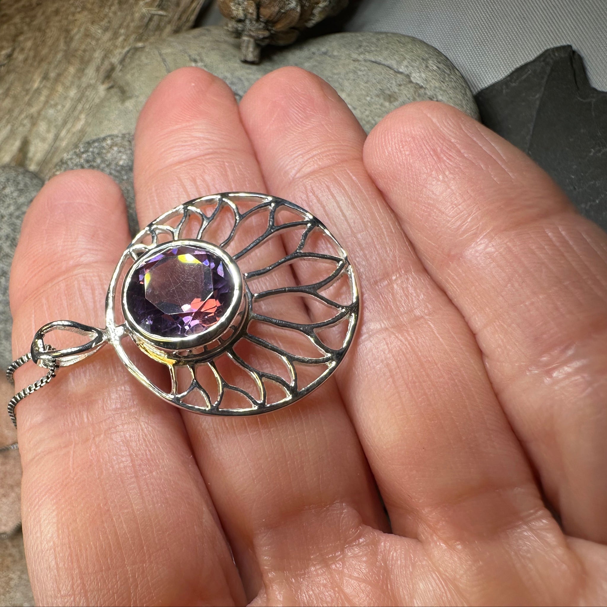 Beautiful Celtic Flower Necklace in Sterling Silver- a symbol of lasting life and love - with lovely natural gemstone round shaped amethyst (Grade AA stone) is set in the center to add vibrant color. Measures 1" x 1" in size - solid sterling silver on an 18" chain.