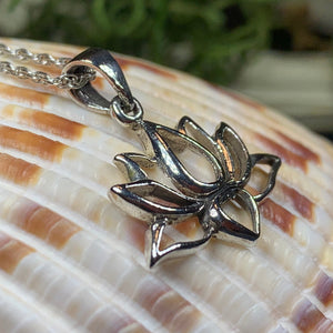 Solid sterling silver on a chain -- An attractive Lotus Sterling Silver Pendant using a traditional design featuring the Lotus. The lotus is beautifully highlighted with simple lines that are attractive and feminine.