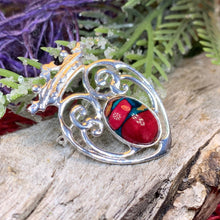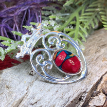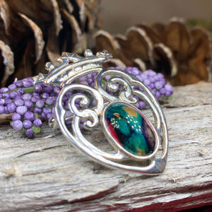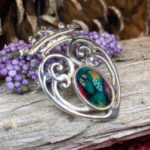 The unique 1/2" high center stone of this 1 1/2' x 1" sterling silver brooch is made from heather gathered in Scotland's highlands.