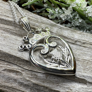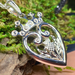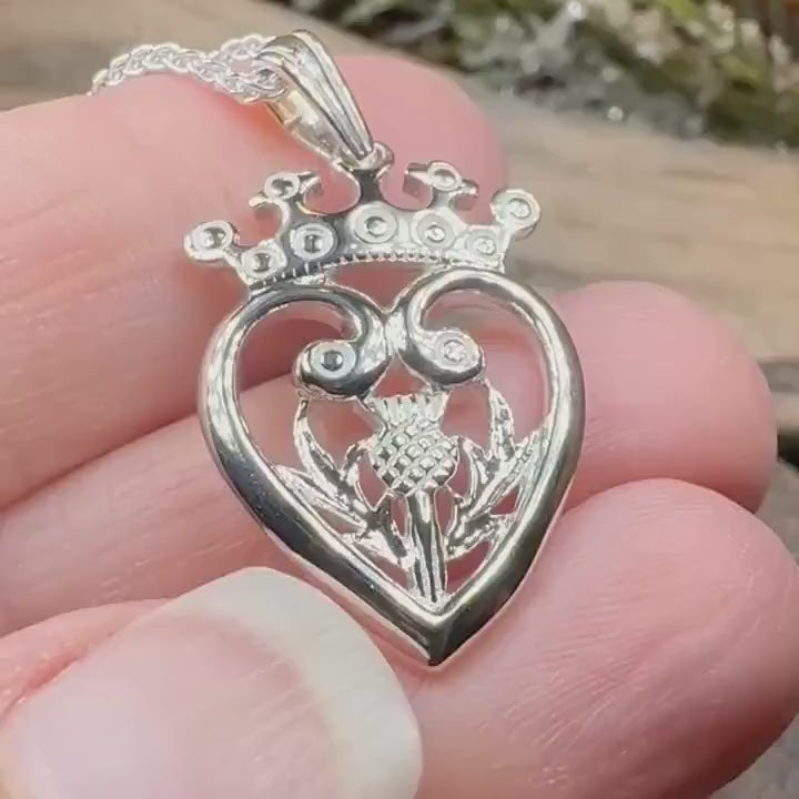 Lovely highly polished sterling silver heart and crown necklace. This Luckenbooth features elegant lines entwined in a Celtic knot design with a thistle - a beautiful symbol of everlasting love and loyalty.