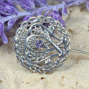 Our highly attractive Luckenbooth Sterling Silver Pin is inspired by the Outlander series of books and the unique Luckenbooth, enhanced with an Amethyst stone.The symbolic design consists of the interlocking hearts surmounted by the crown of Mary Queen of Scots, the Luckenbooth was traditionally exchanged between lovers. A beautiful story behind a stunning piece of jewelry.