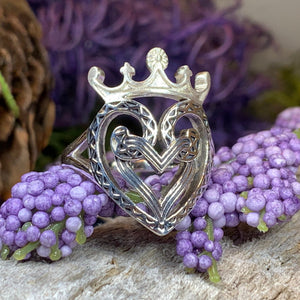 The symbolic design consists of the interlocking hearts surmounted by the crown of Mary Queen of Scots. This piece is made extra special with having the crown of the ring in a satin finish to add interest.