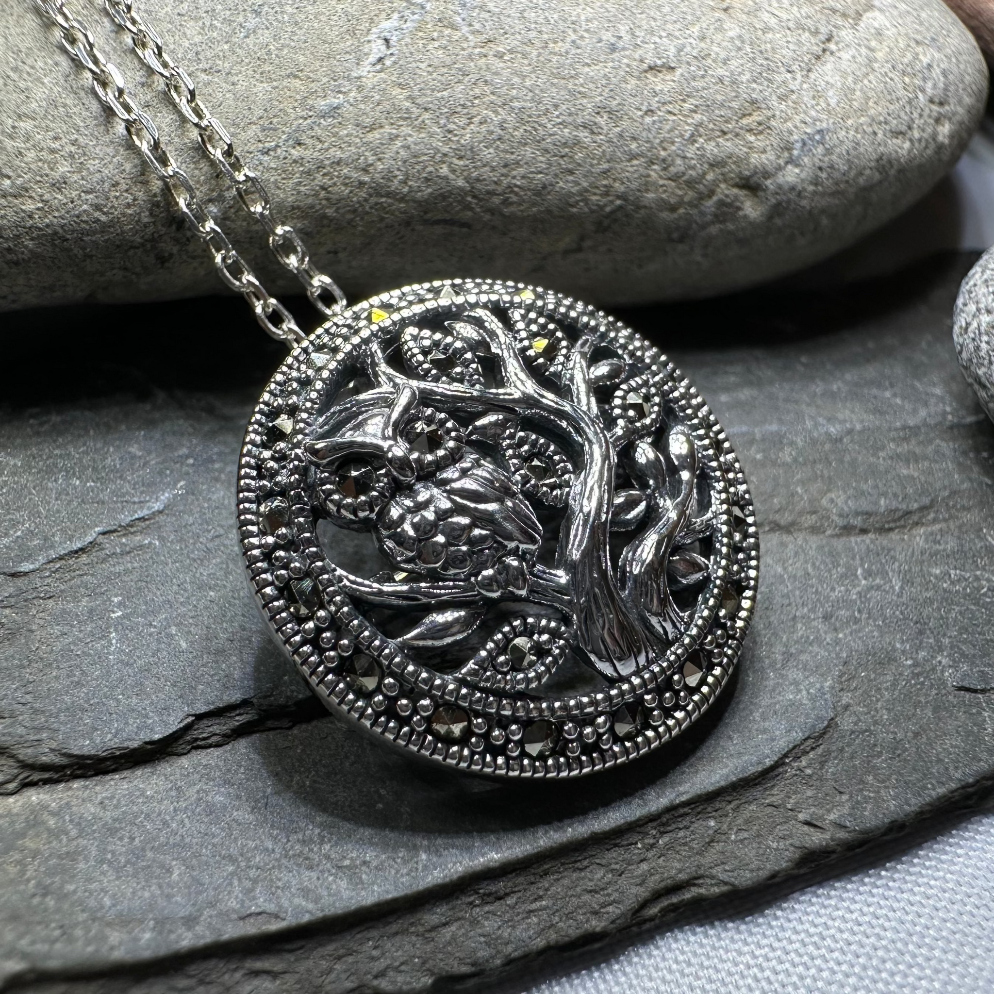 This exquisite pendant showcases a delicate owl gracefully perched within a radiant autumn tree, each leaf adorned with shimmering marcasite gemstones that capture the essence of fall.