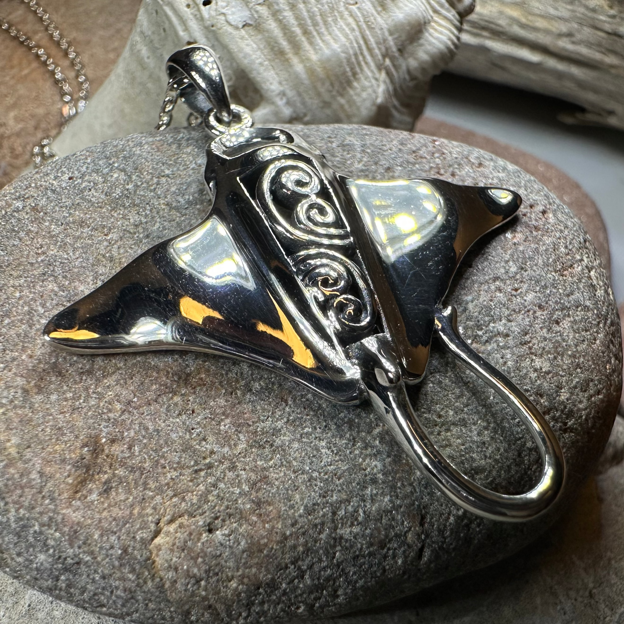 Highly polished, this handcrafted Celtic Manta Ray Sterling Silver Pendant showcases the beauty of nature and the exquisite craftsmanship