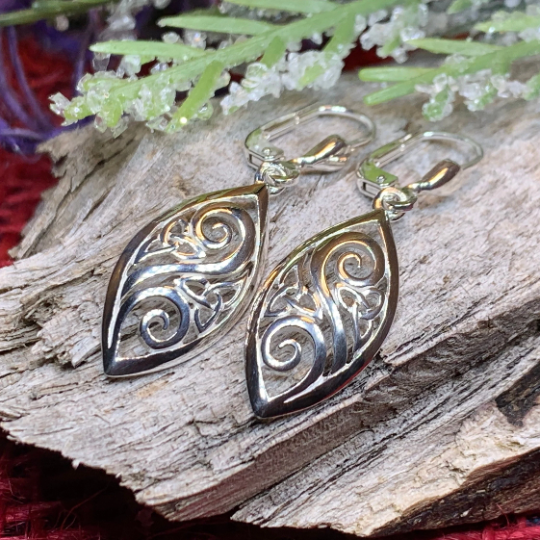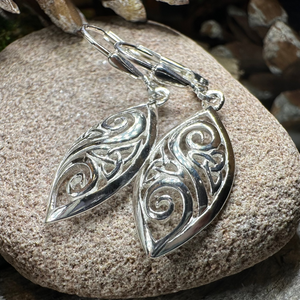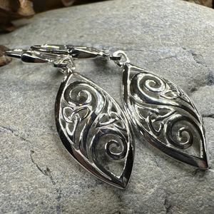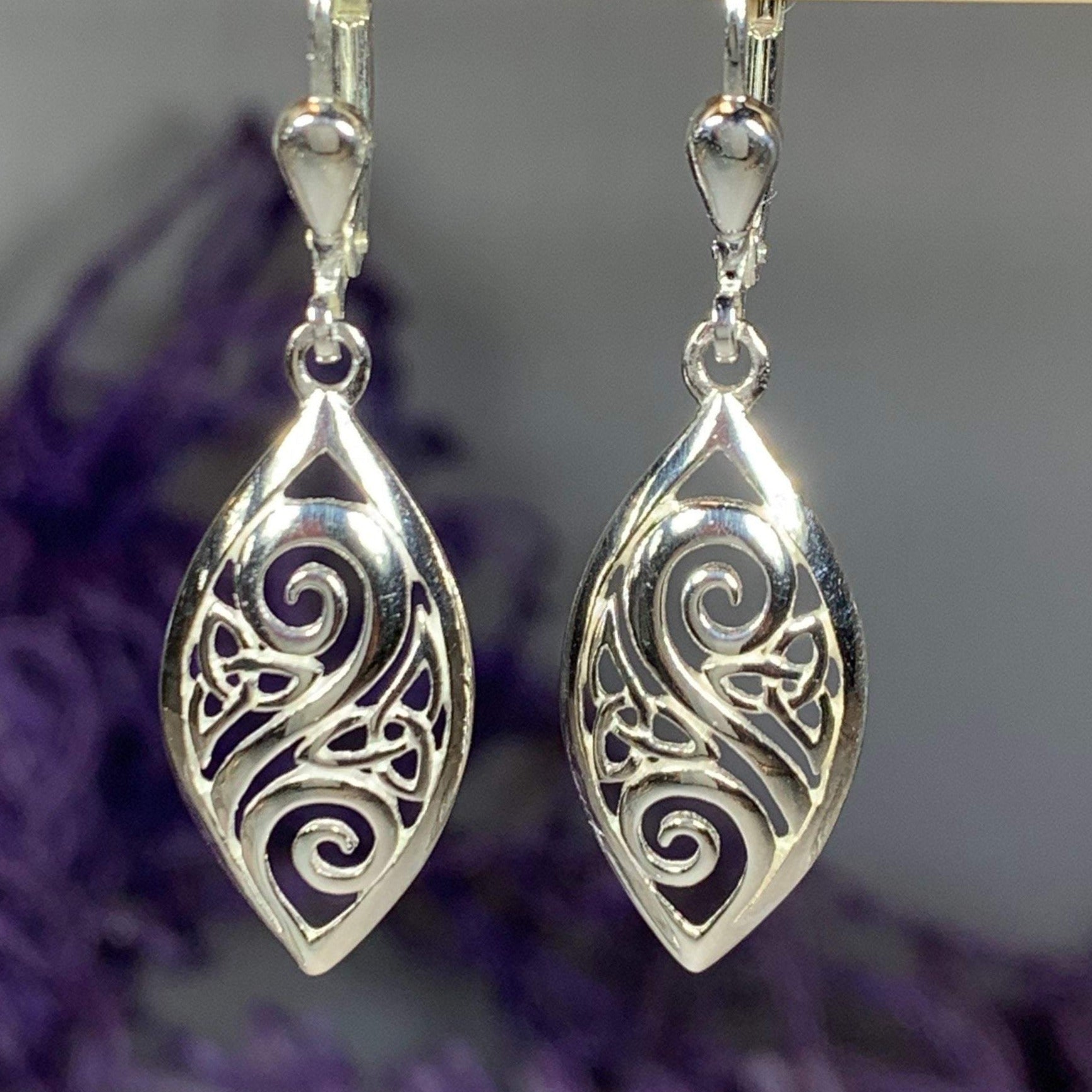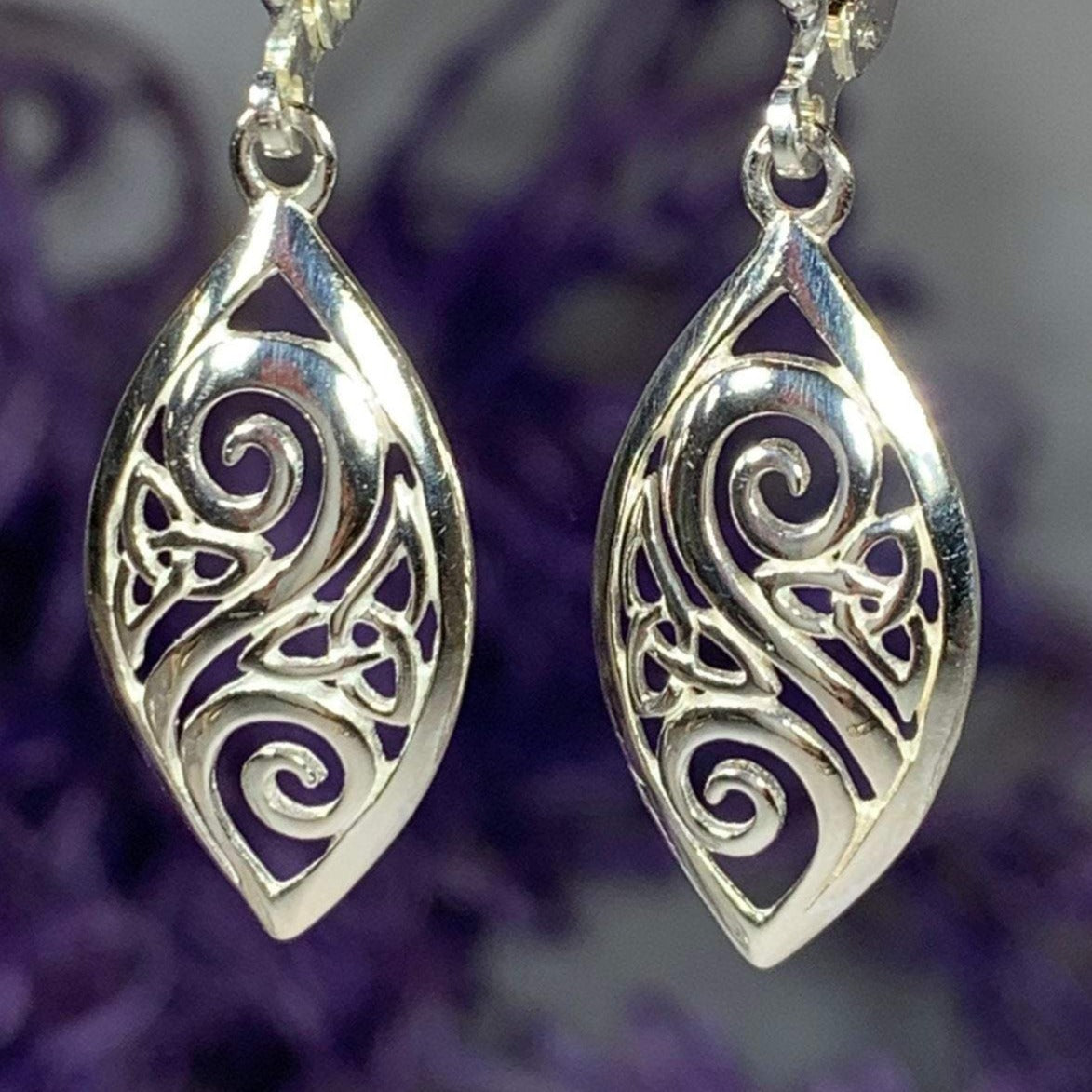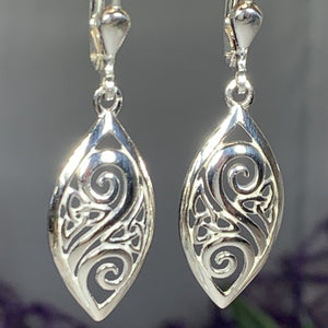 Solid Sterling Silver with lever back closure - Marquise shaped spiral and trinity knot drop earrings.