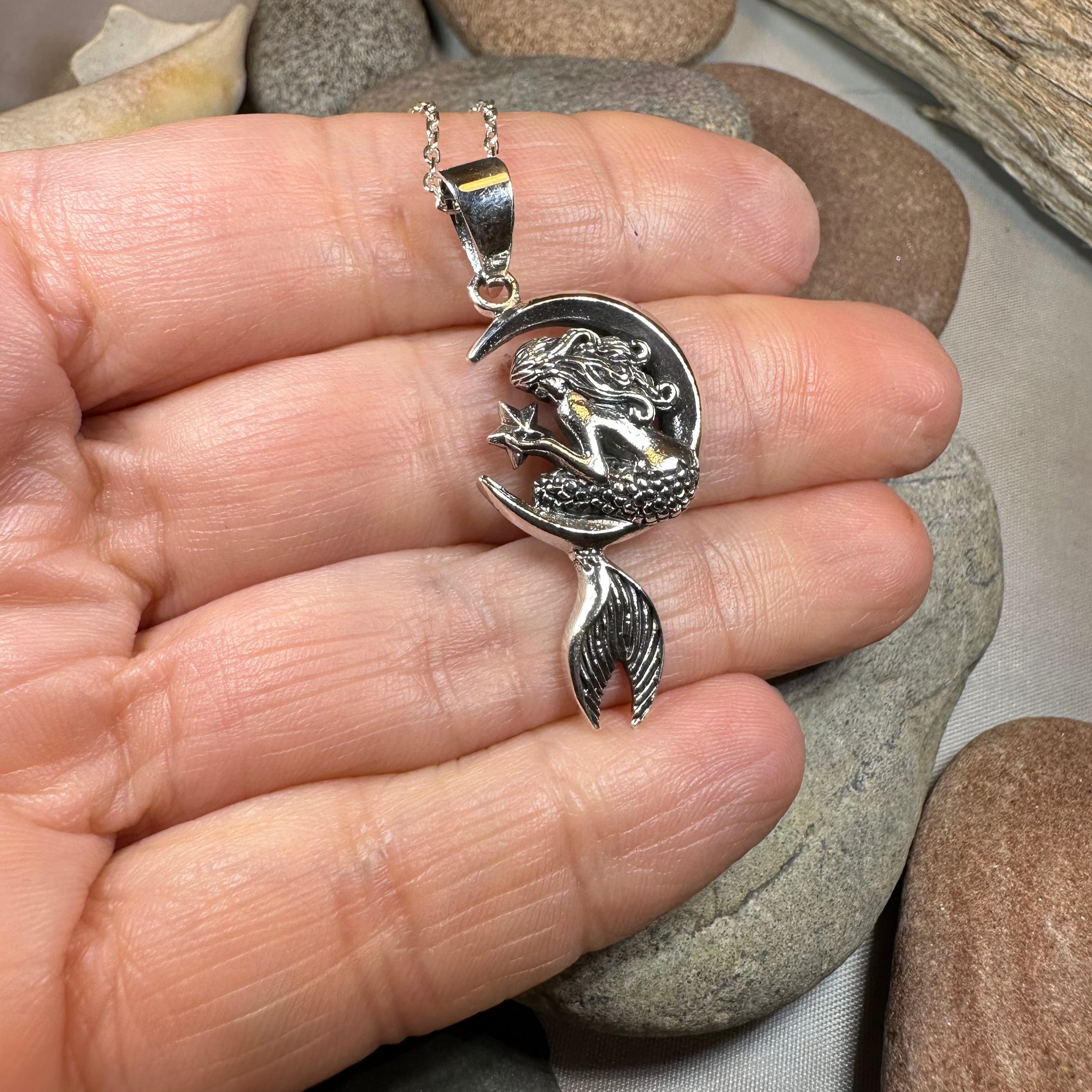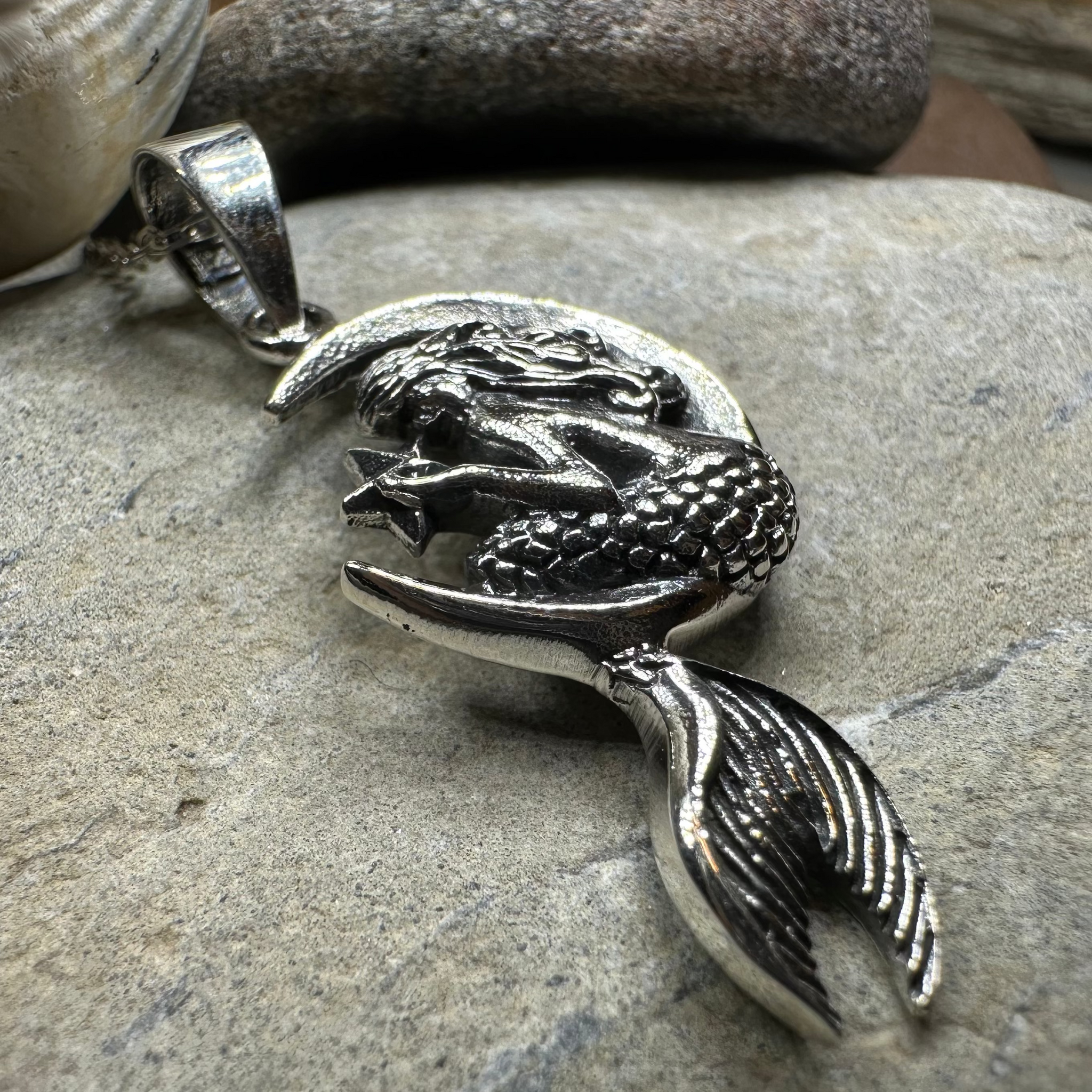 1 1/4" x 3/4" Mermaid on the Moon pendant on an 18" chain - solid sterling silver.