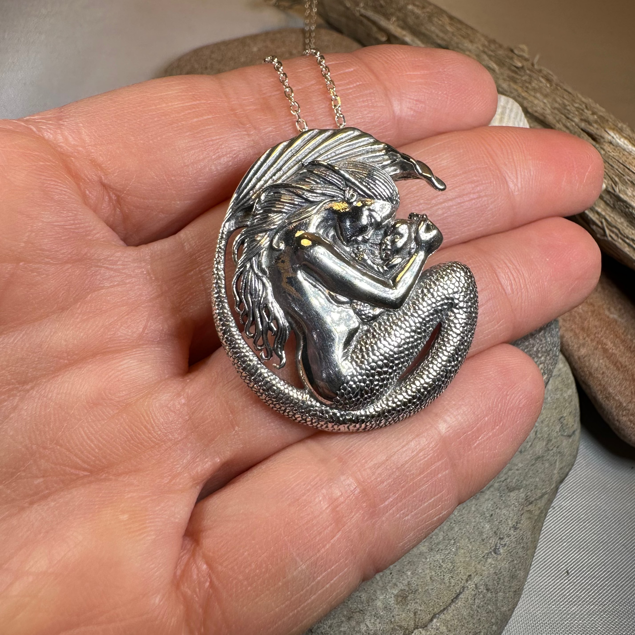 Inspired by a serene scene where a graceful mother mermaid cradles her child beneath a starlit sky, this pendant captures the essence of love, tenderness, and devotion. The elegant design, featuring the mermaid’s tail gently curving over her back, symbolizes the nurturing embrace of motherhood.