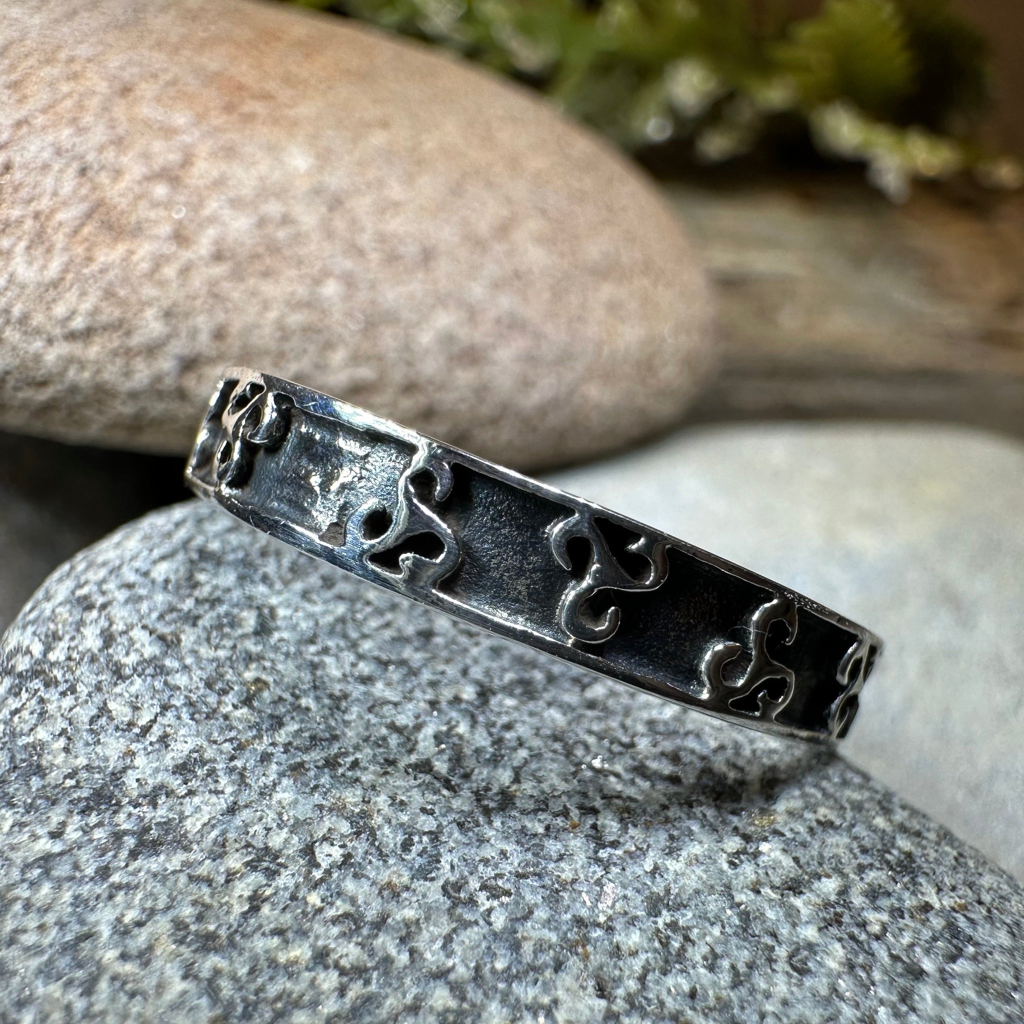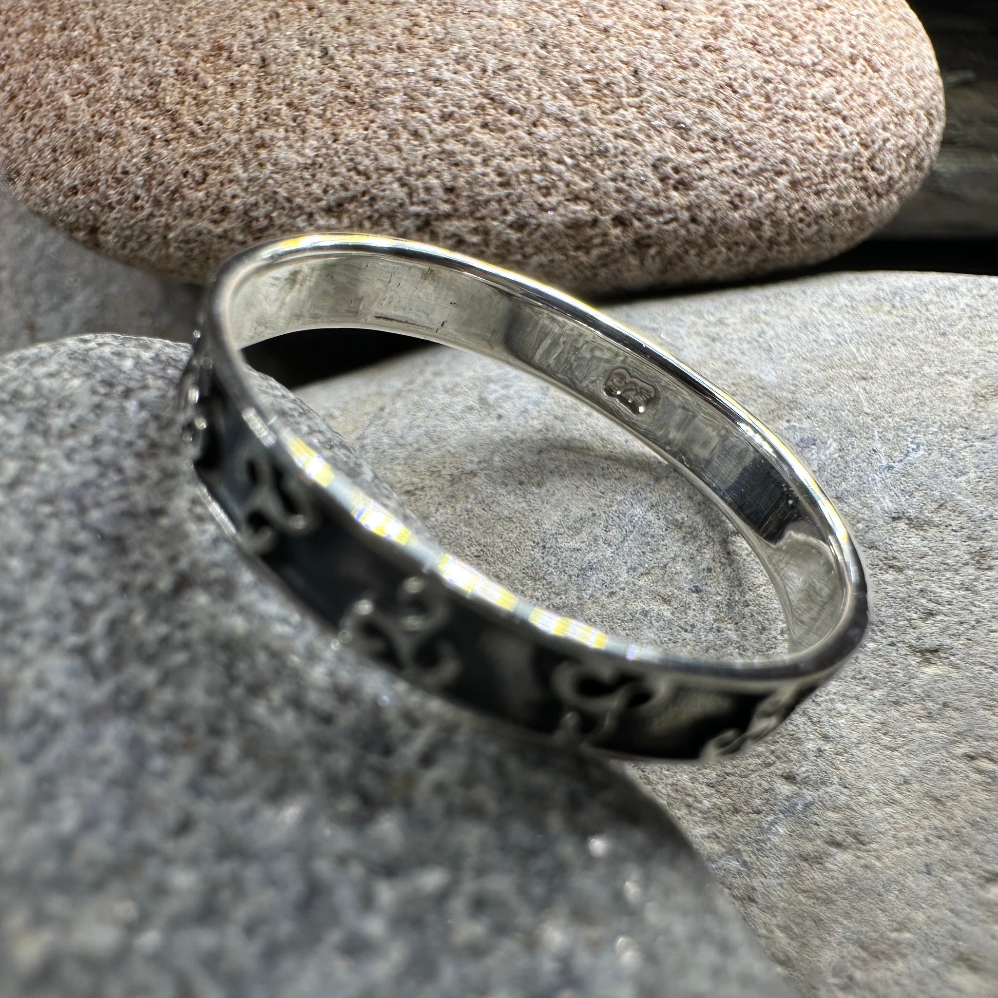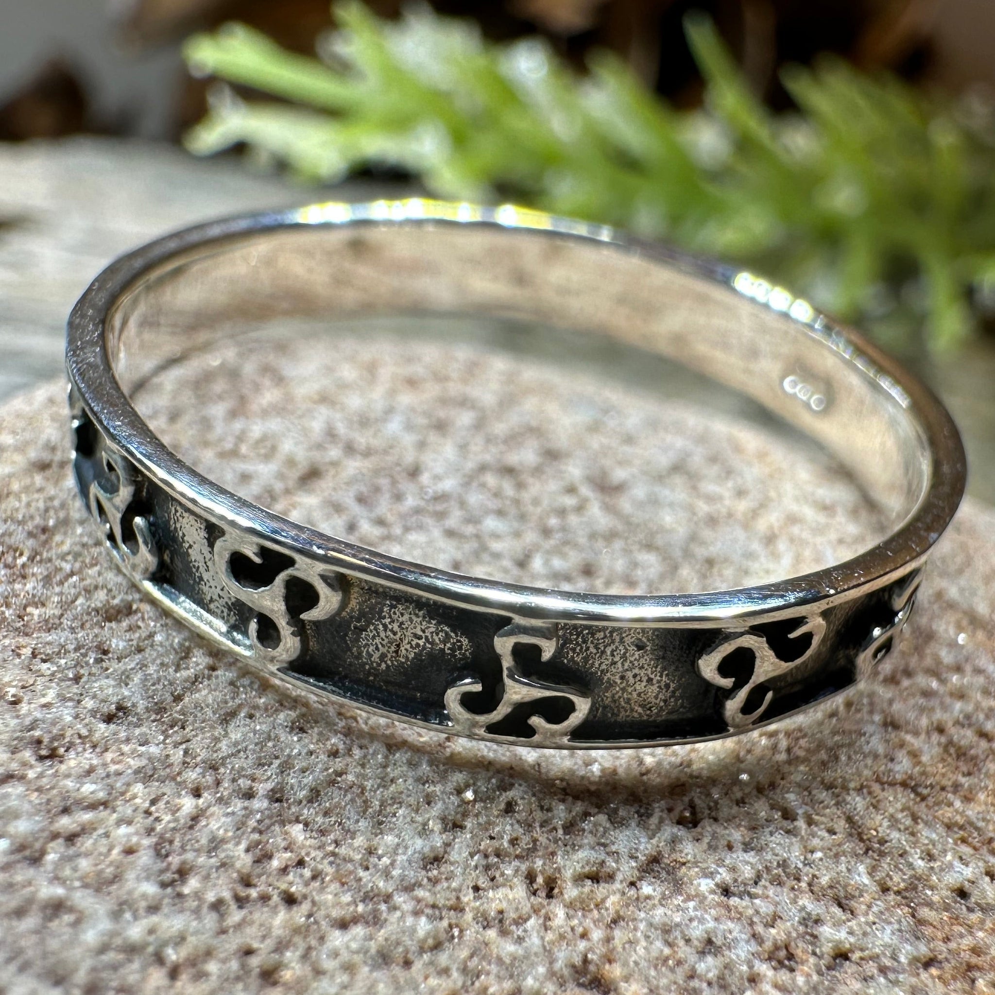 The Celtic spiral inspired design goes all around the ring with a smooth for comfort.