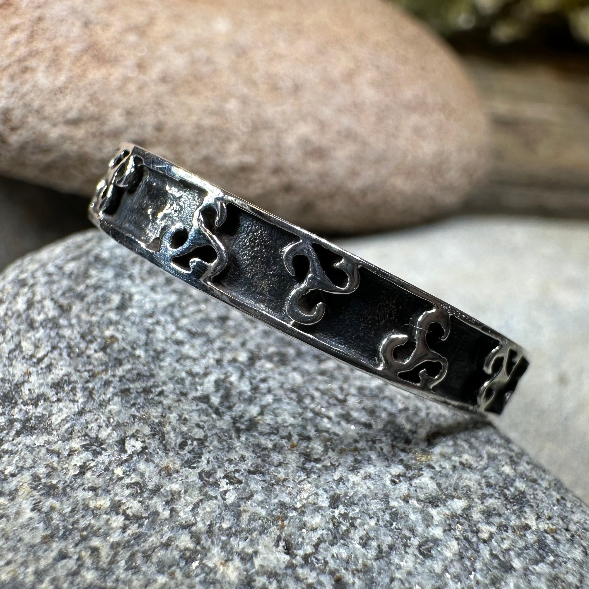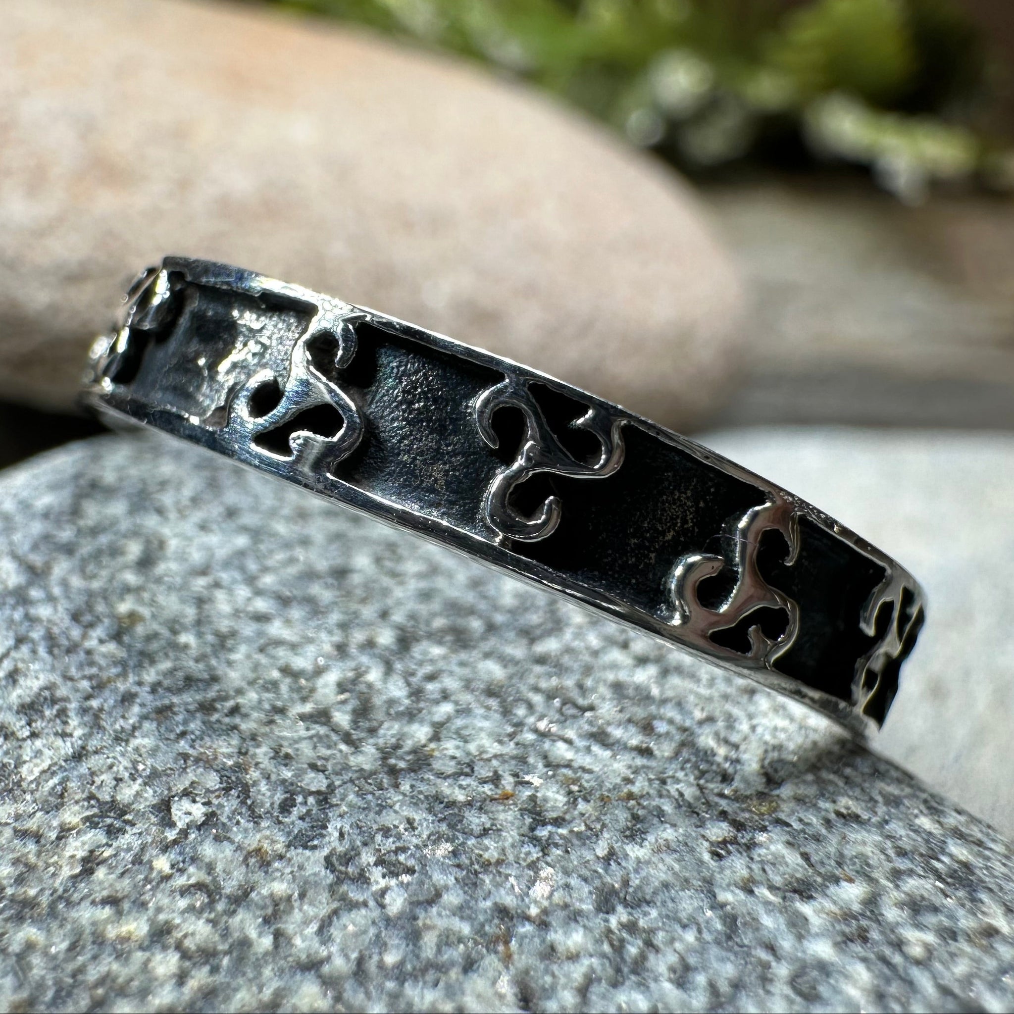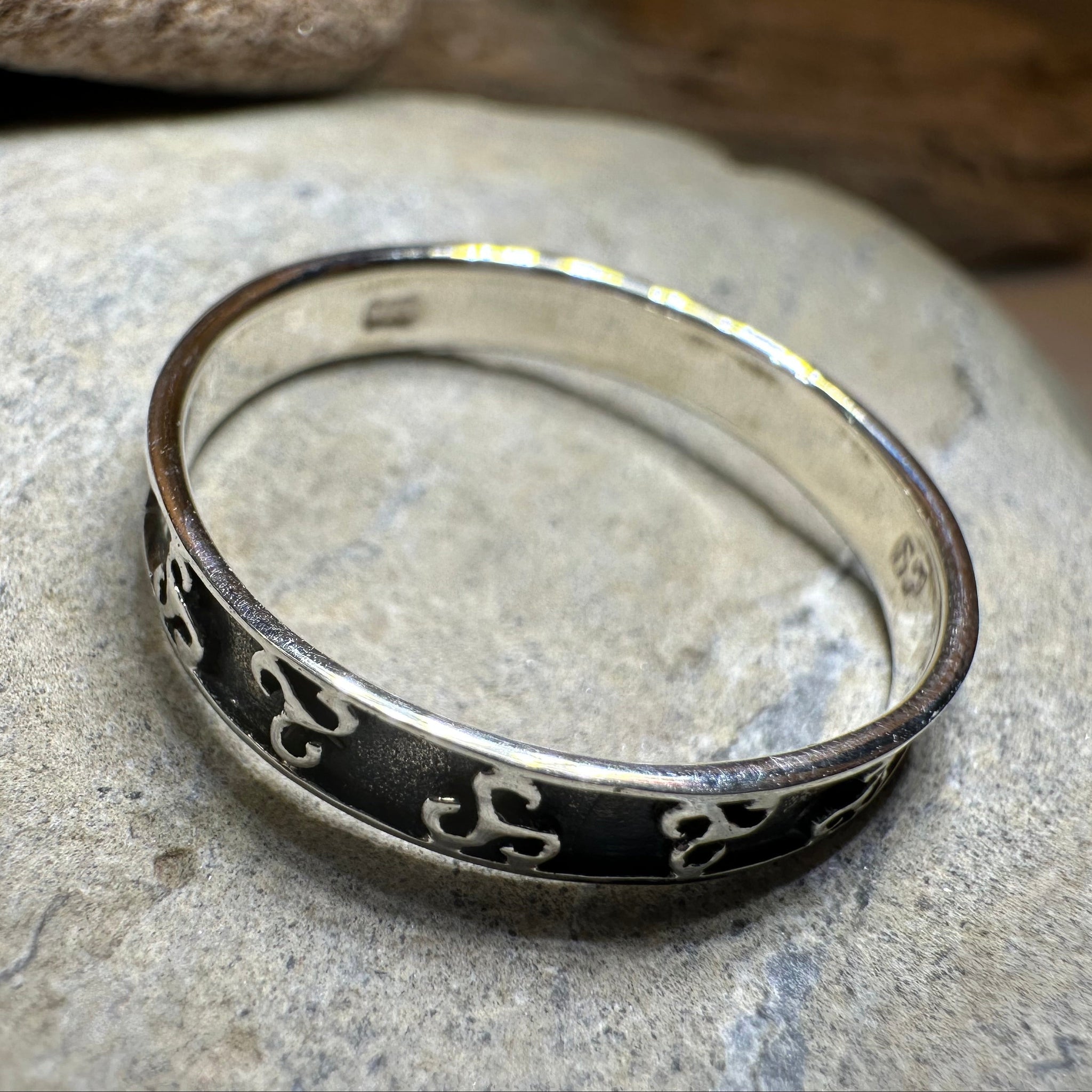 The Celtic spiral inspired design goes all around the ring with a smooth for comfort.