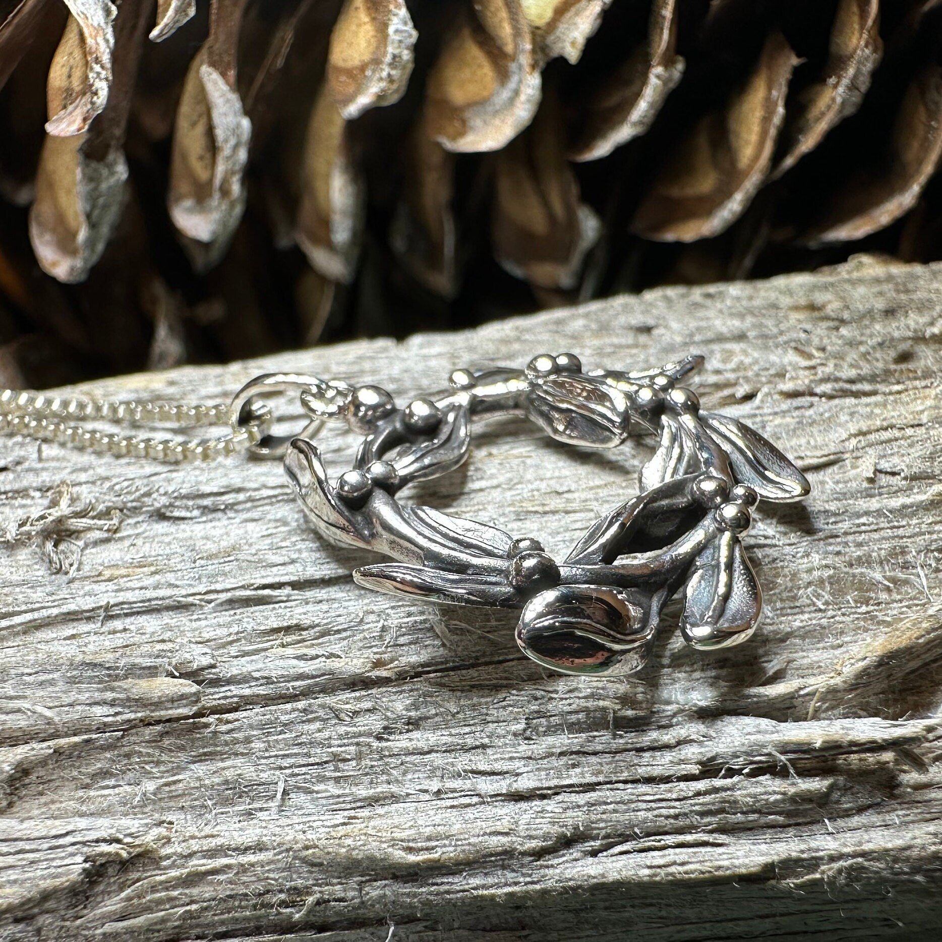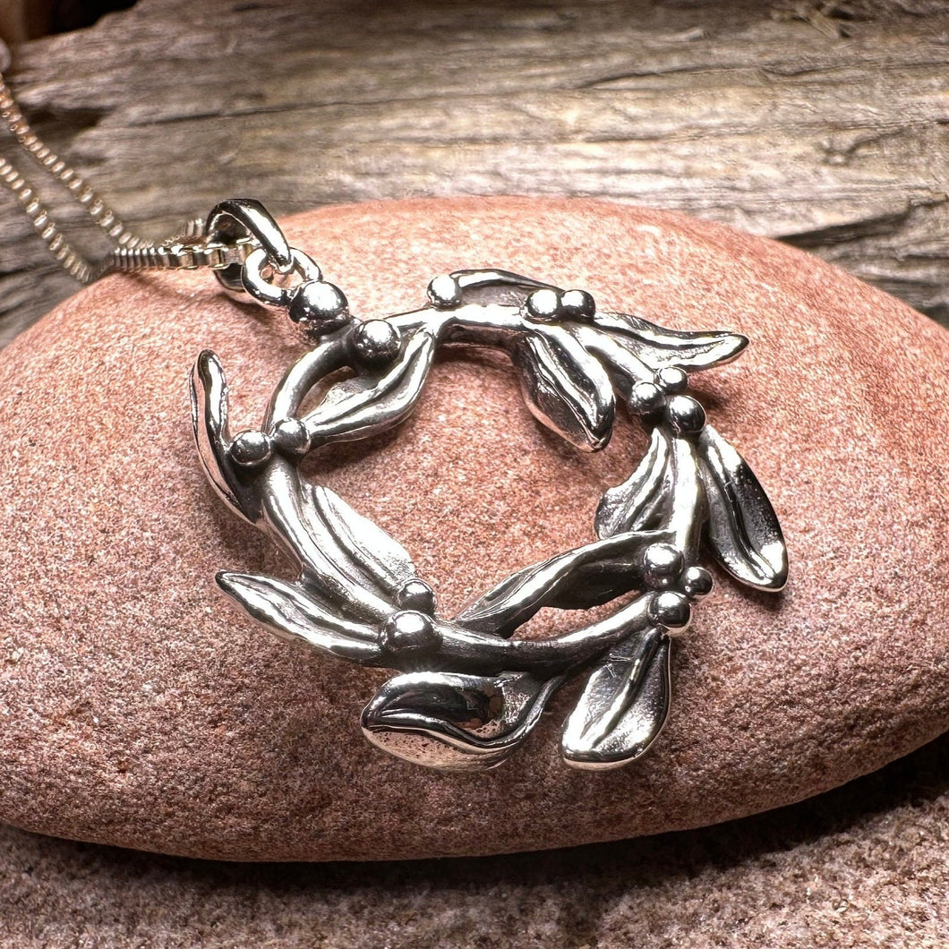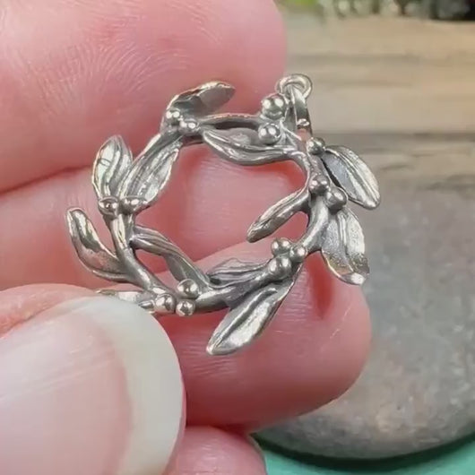 Solid Sterling Silver wreath of mistletoe leaves and berries.
