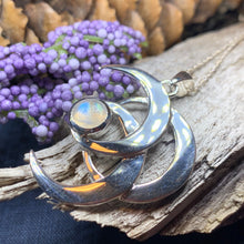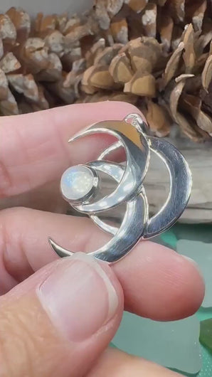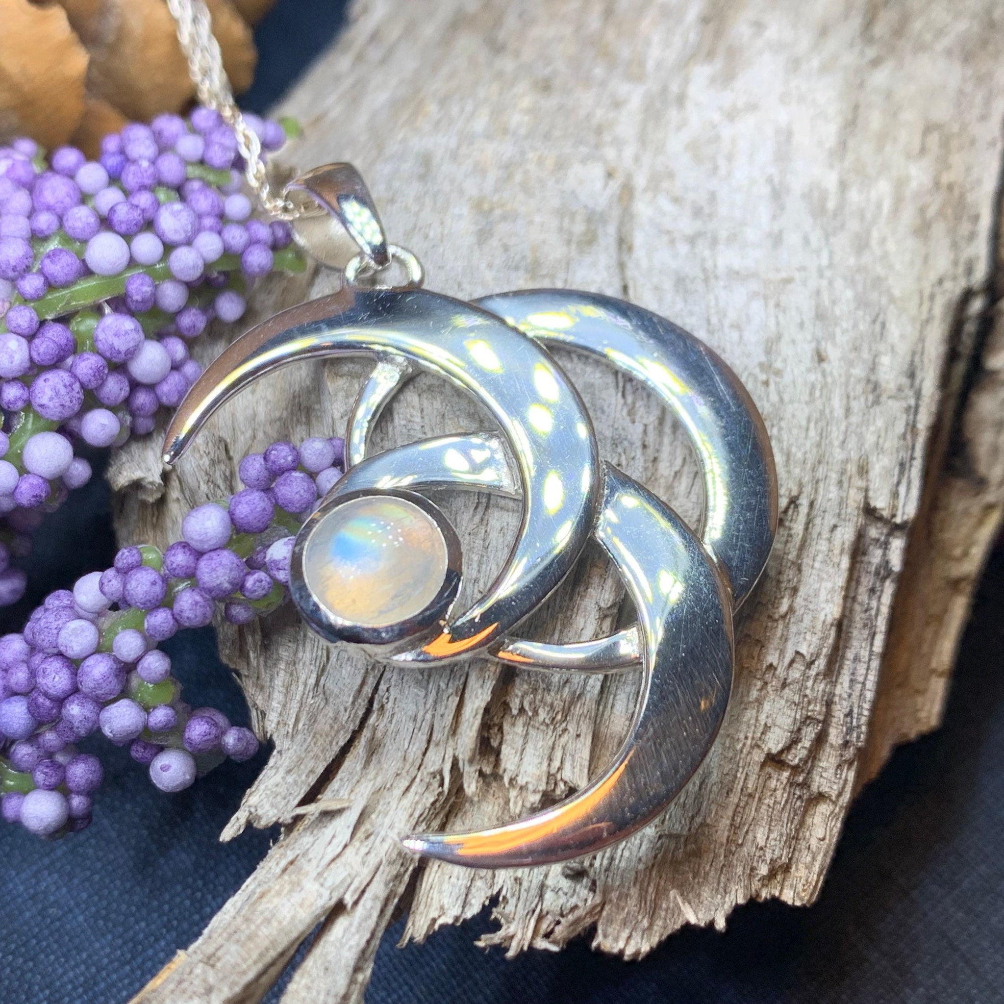 This Triple Moon Necklace is adorned with three crescent moons and a Moonstone full moon center - an artful rendition of an ancient design. Three crescent moons embrace the gemstone moonstone and captures the beauty of the crescent moon.