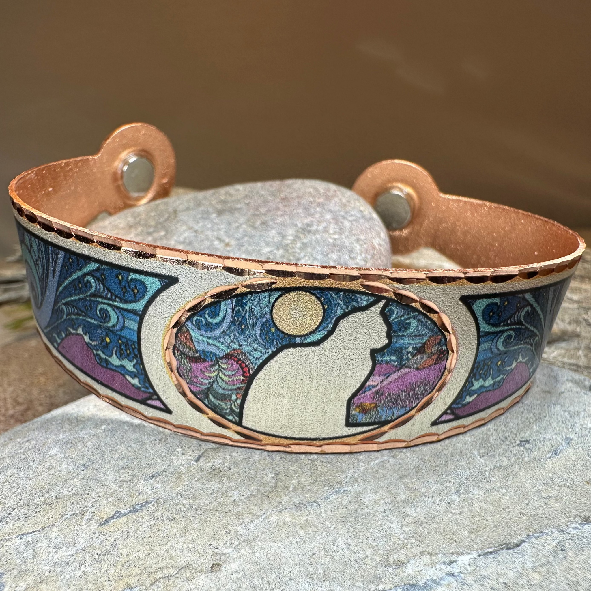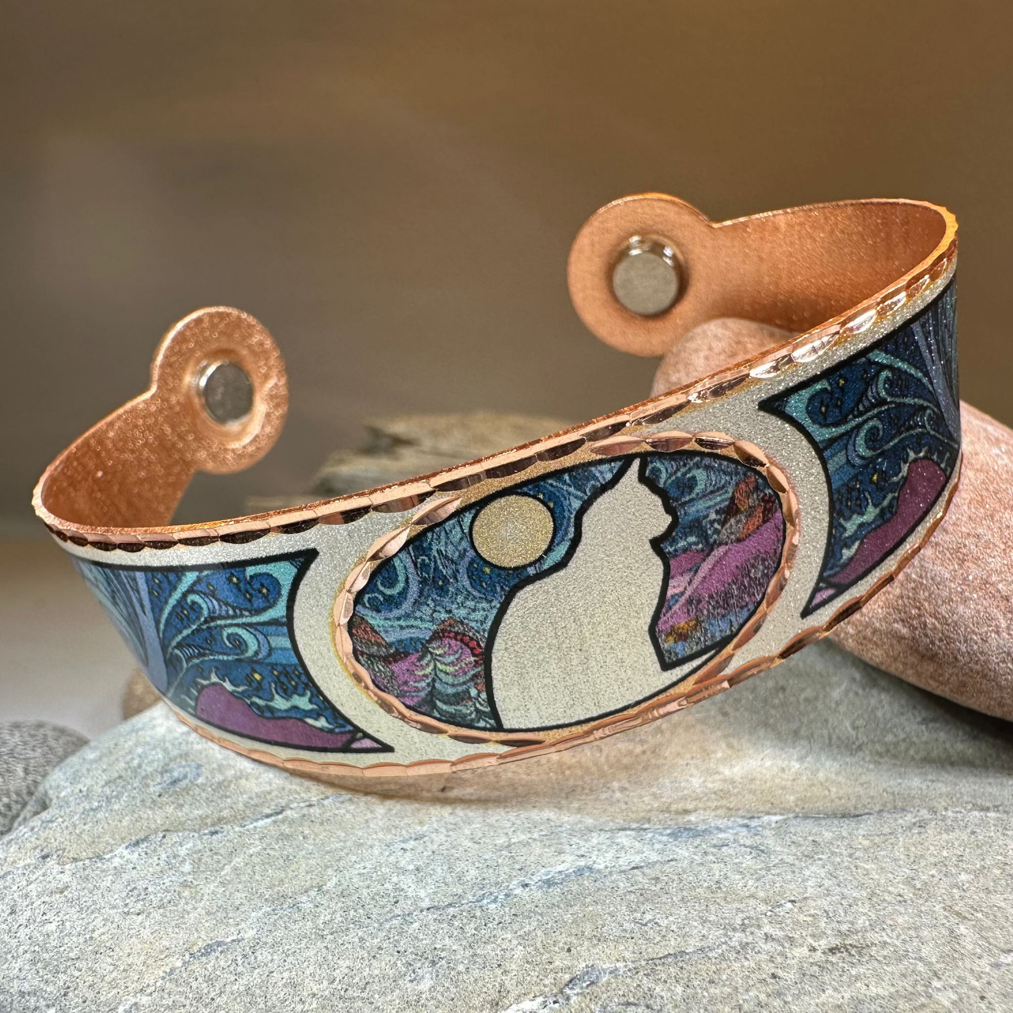 Stunning! Our handmade artisan Copper Moondreamer Cat Bracelet features a cat with a full moon design in copper and silver with colorful blue, purple and teal detail on the sides. The sides of the bracelet feature colorful design - so the design is all around the piece.
