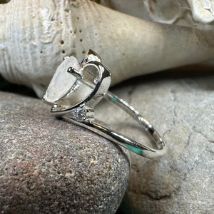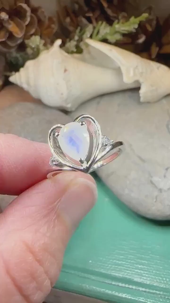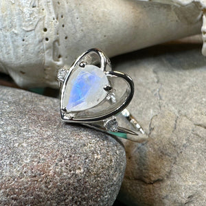 This Solid Sterling Silver Rainbow Moonstone Celtic Heart ring with a beautiful pear shaped, faceted rainbow Moonstone (1 1/2 carat stone weight) with two diamond zirconia accent gemstones.