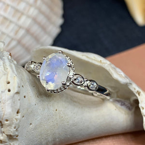 Meticulously crafted from fine sterling silver with beautiful detailing, this Rainbow Moonstone ring showcases the beauty of tradition, modern design, and fine craftsmanship.