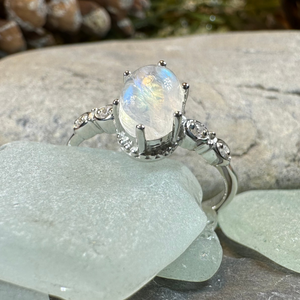 Meticulously crafted from fine sterling silver with beautiful detailing, this Rainbow Moonstone ring showcases the beauty of tradition, modern design, and fine craftsmanship.