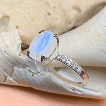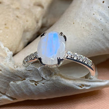 This Solid Sterling Silver Rainbow Moonstone ring with a beautiful faceted, oval rainbow Moonstone (2 carat stone).