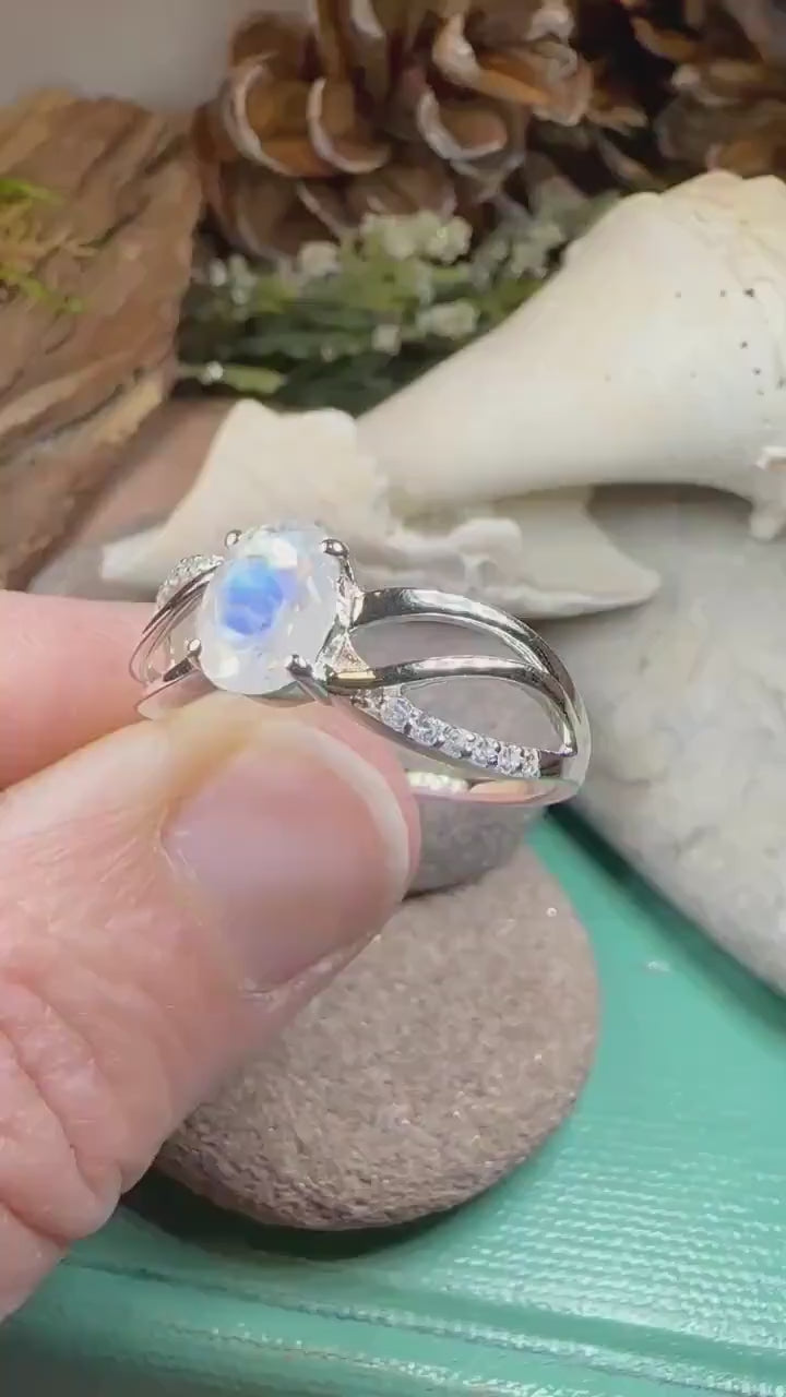 This Solid Sterling Silver Rainbow Moonstone ring with a 1 carat oval faceted rainbow Moonstone. This ring is hard to miss on your hand!