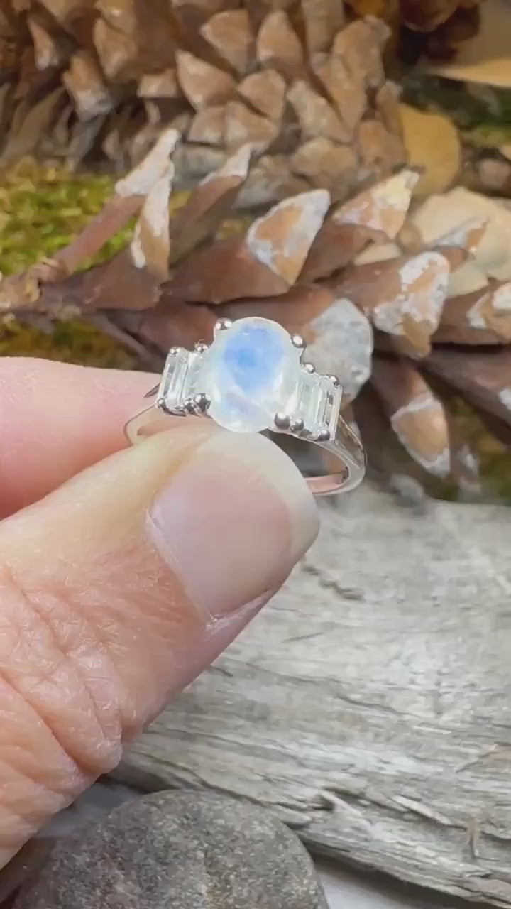 The ring is adorned with 4 faceted diamond cubic zirconia of rainbow moonstone baguette sidestones (your choice) and an authentic moonstone center gemstone on a solid sterling silver band. An artful rendition of the traditional ring.