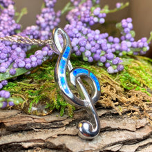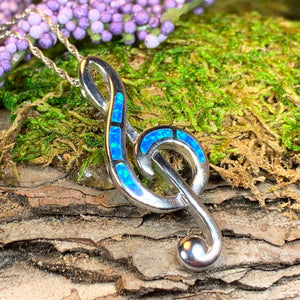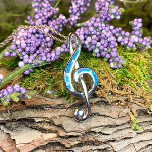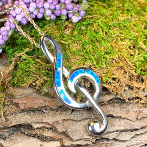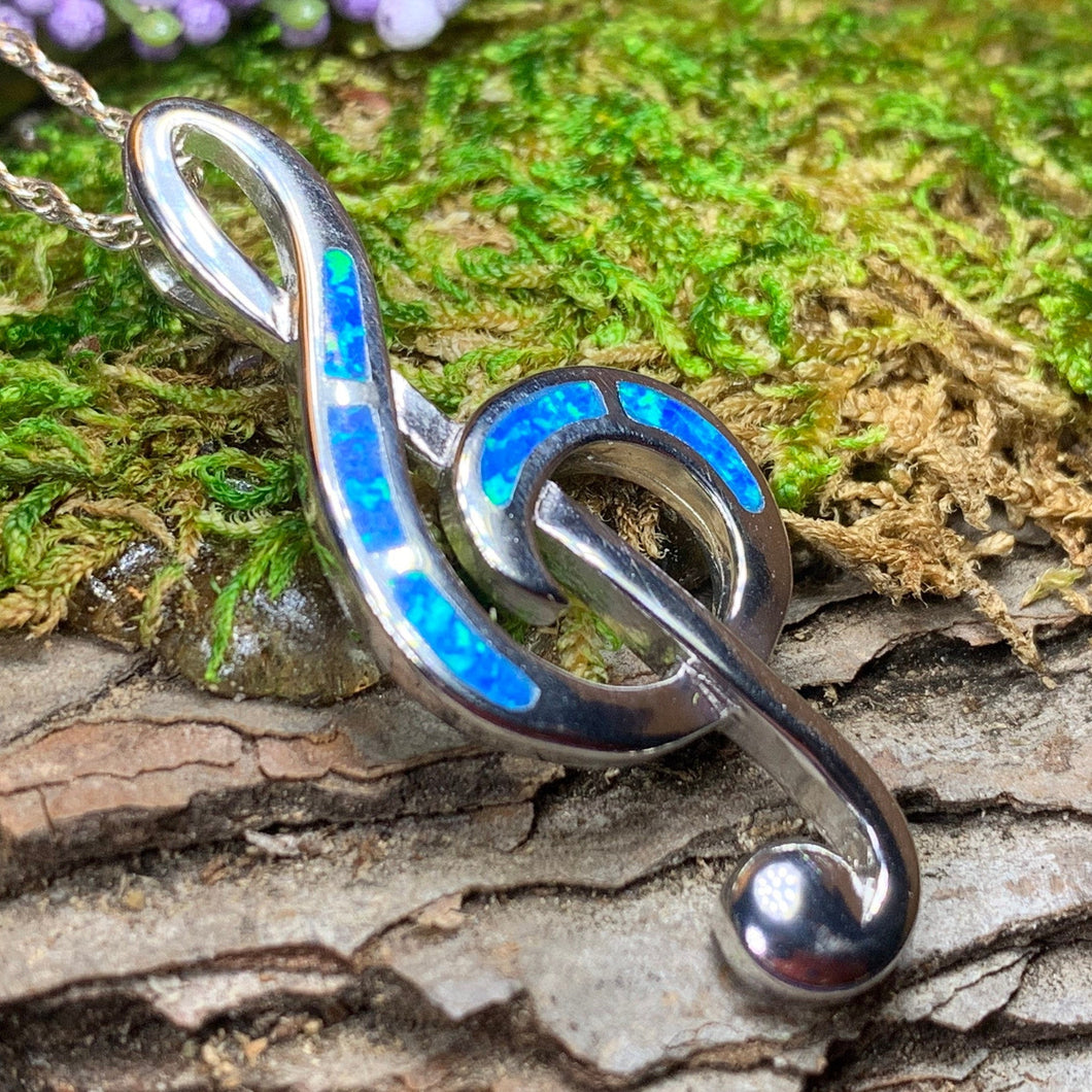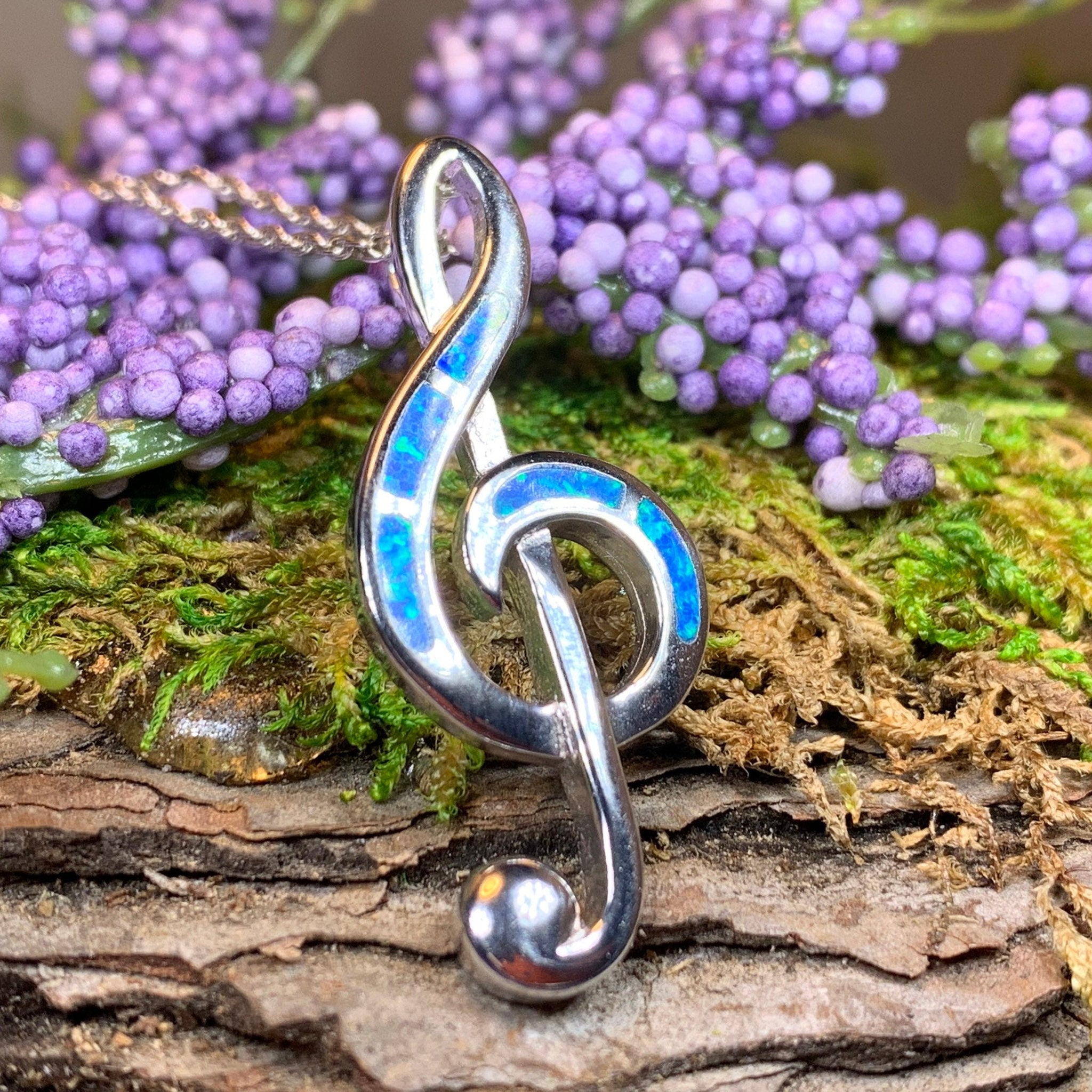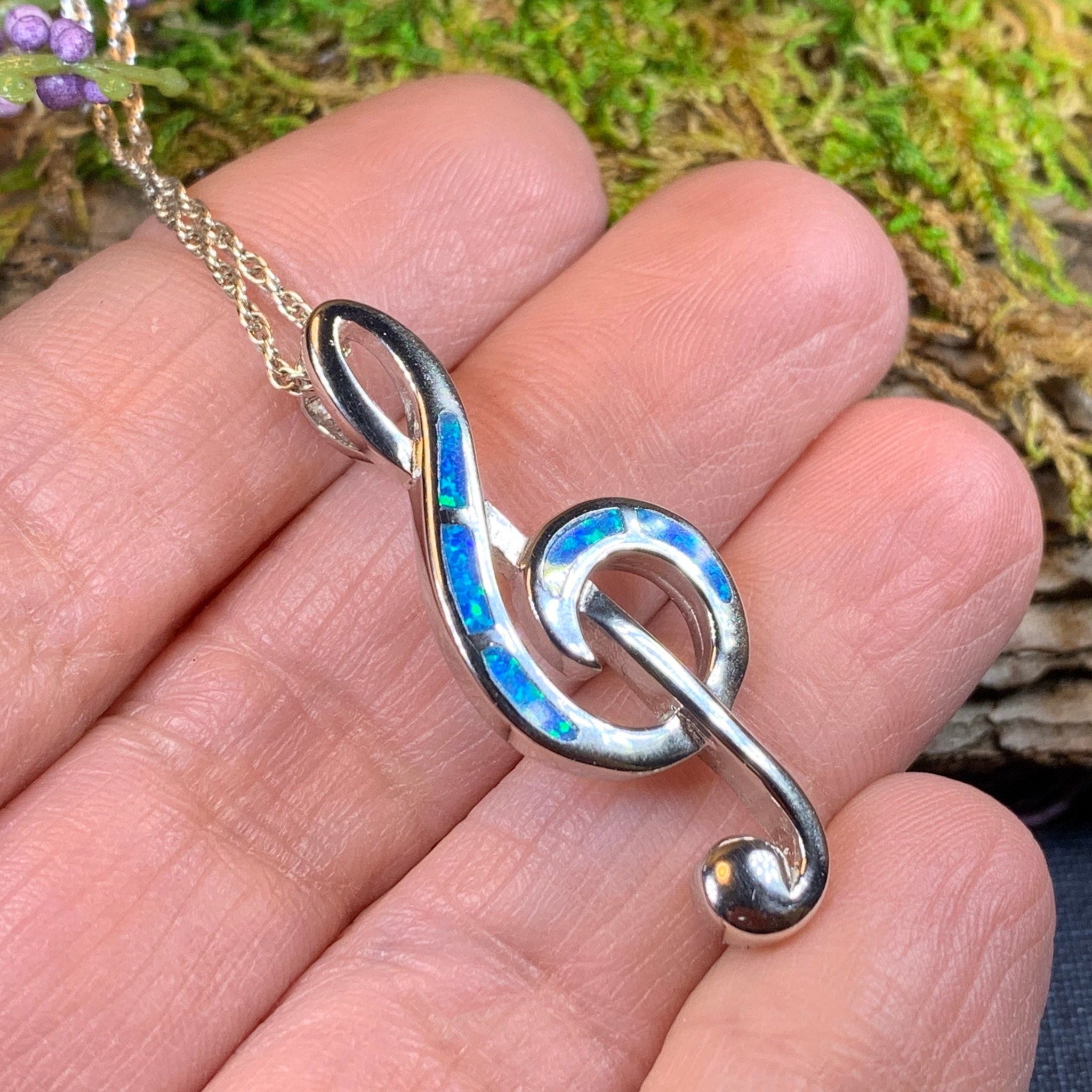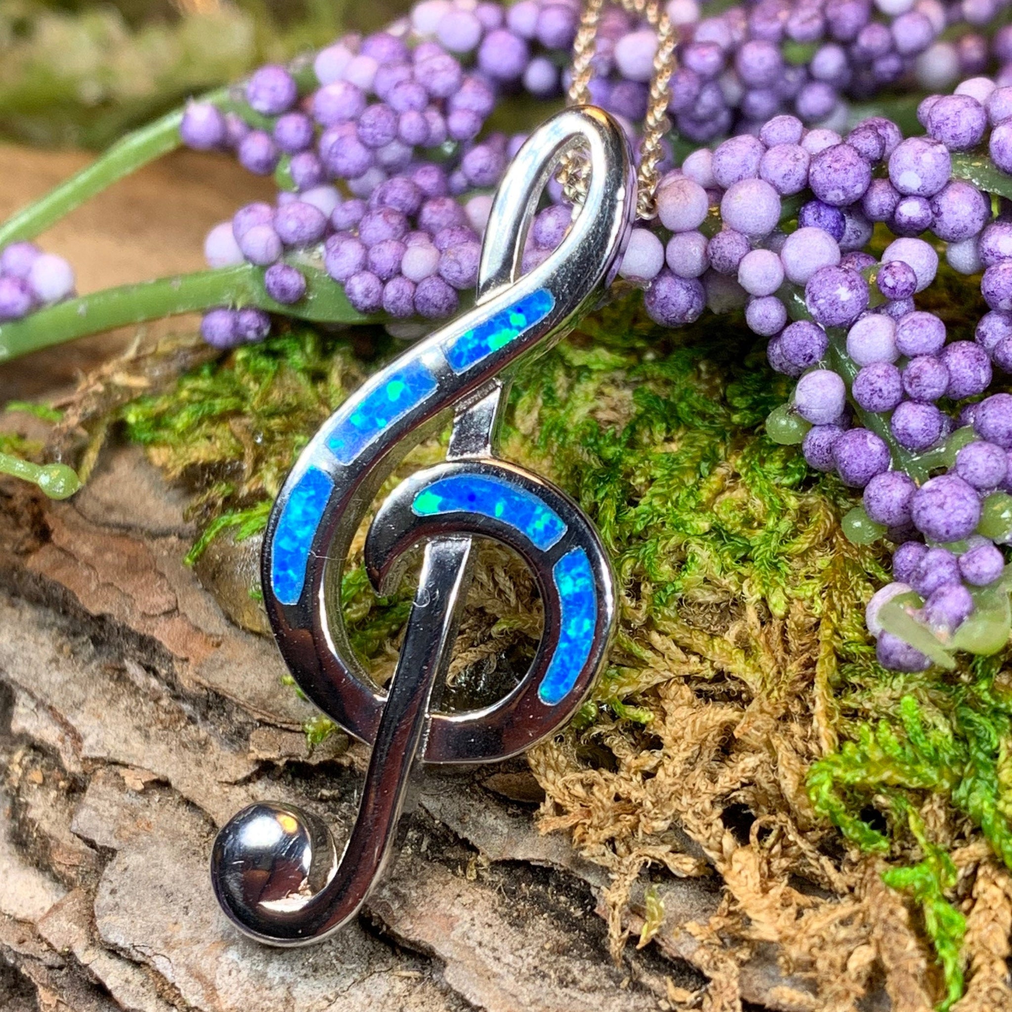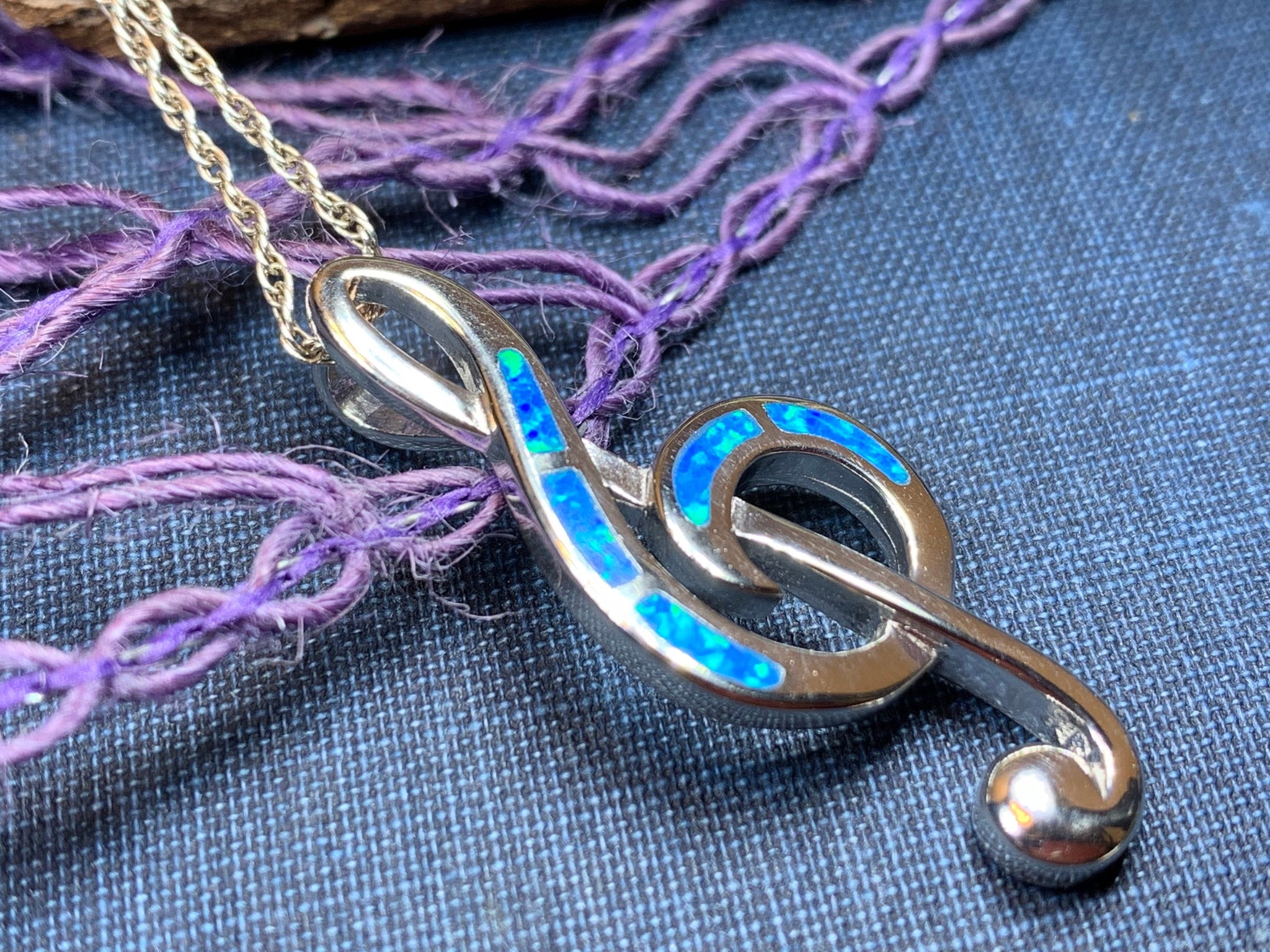 Solid Sterling Silver - This handmade piece must be seen in person! The high polish of the music notes with the bright lab-created opal inset really makes this unique piece shine.