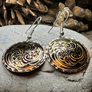 Discover the beauty of our Copper Celtic Earrings, handcrafted with care. These exquisite Dangle Earrings feature a Celtic Spiral pattern in shades of green, gold, and black.