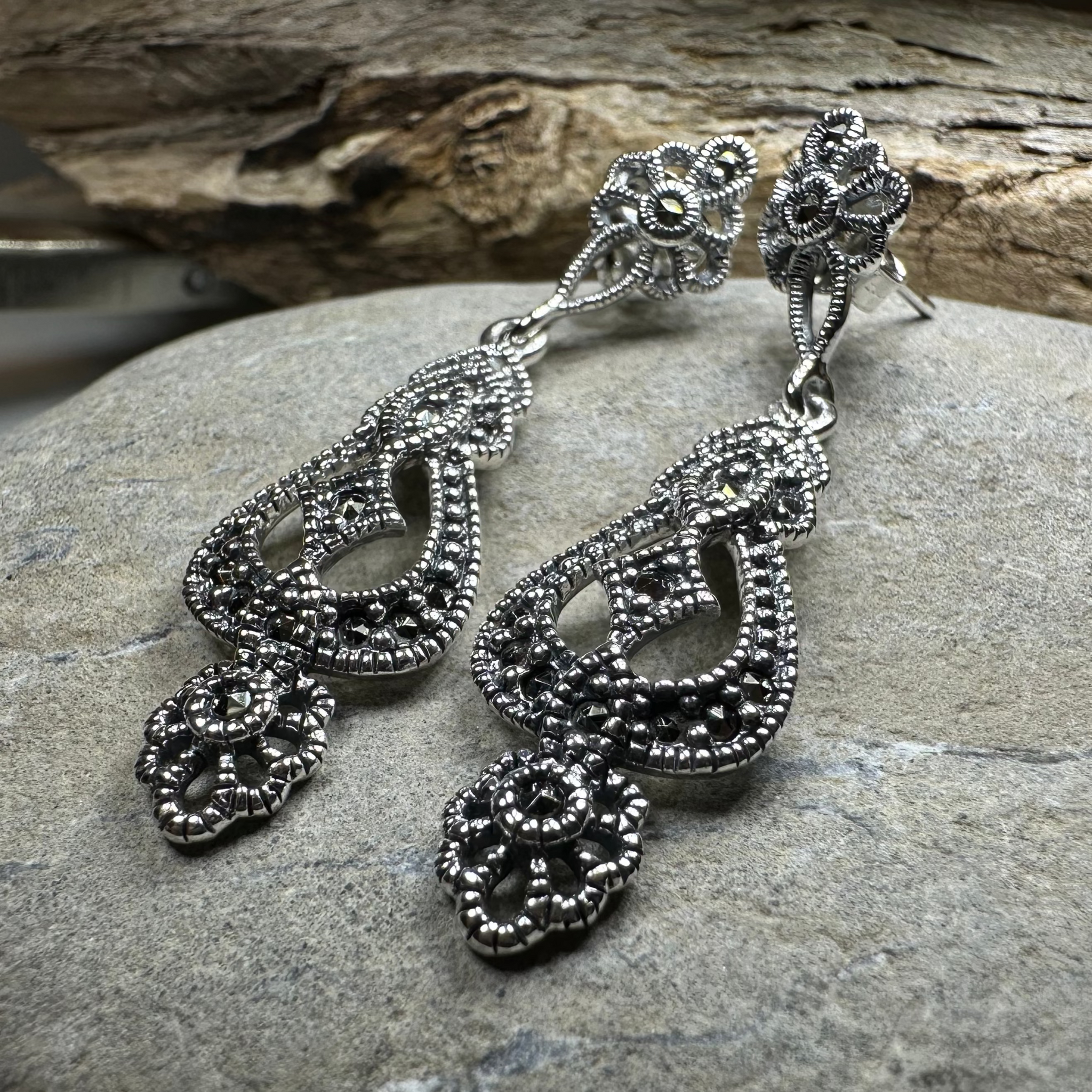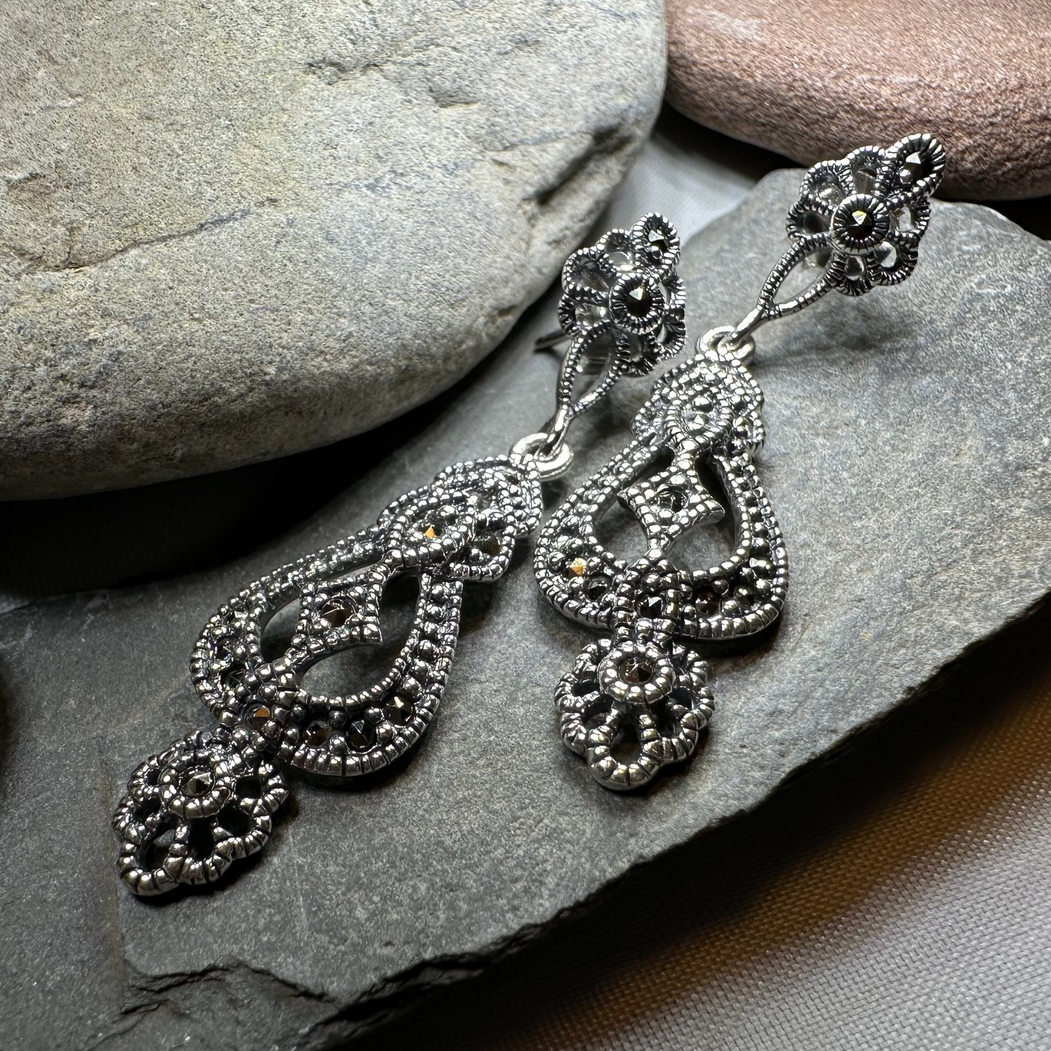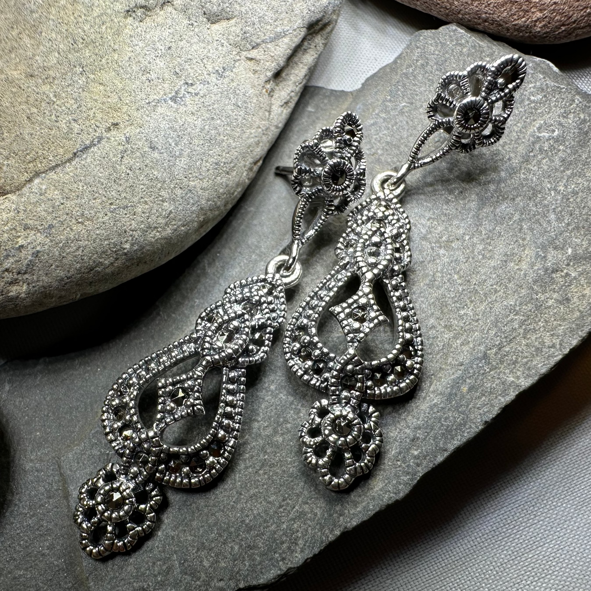 Solid Sterling Silver dangle earrings with sparkling marcasite gemstones and post back closure.