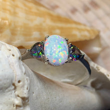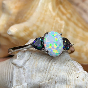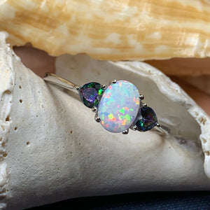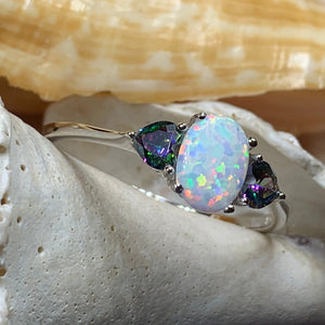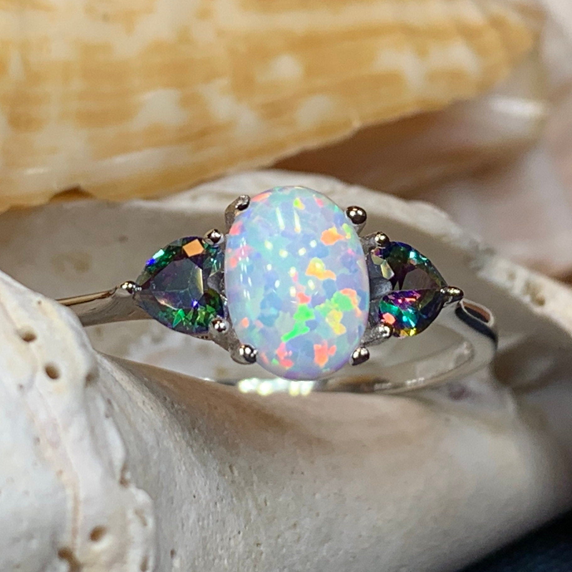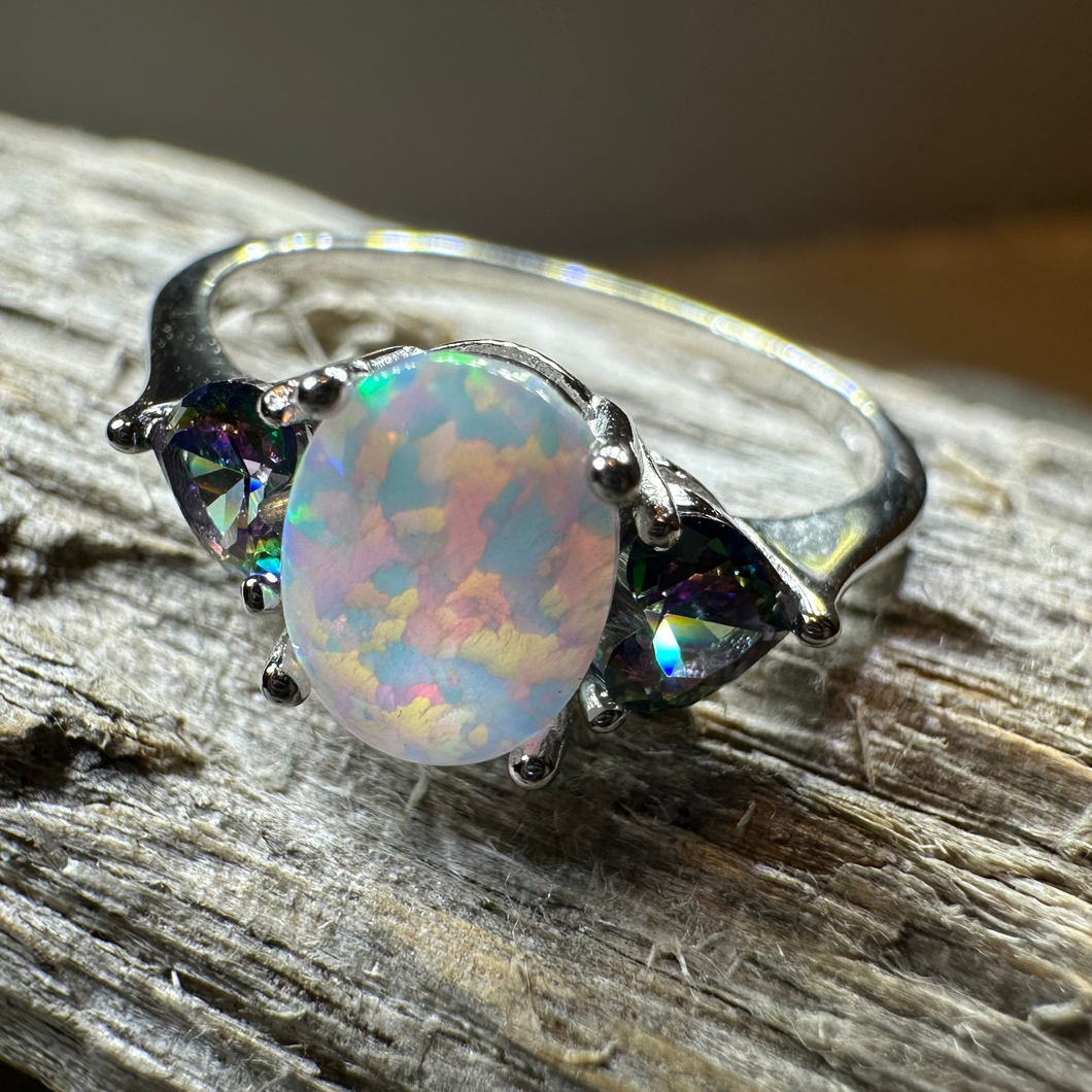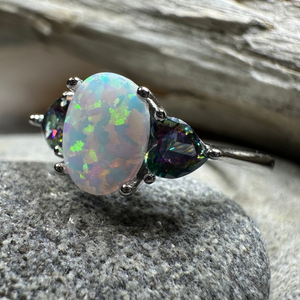 Solid Sterling Silver with created opal and mystic topaz side stones