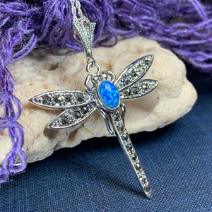 Solid Sterling Silver Dragonfly Pendant with marcasite and lab created opal gemstone.