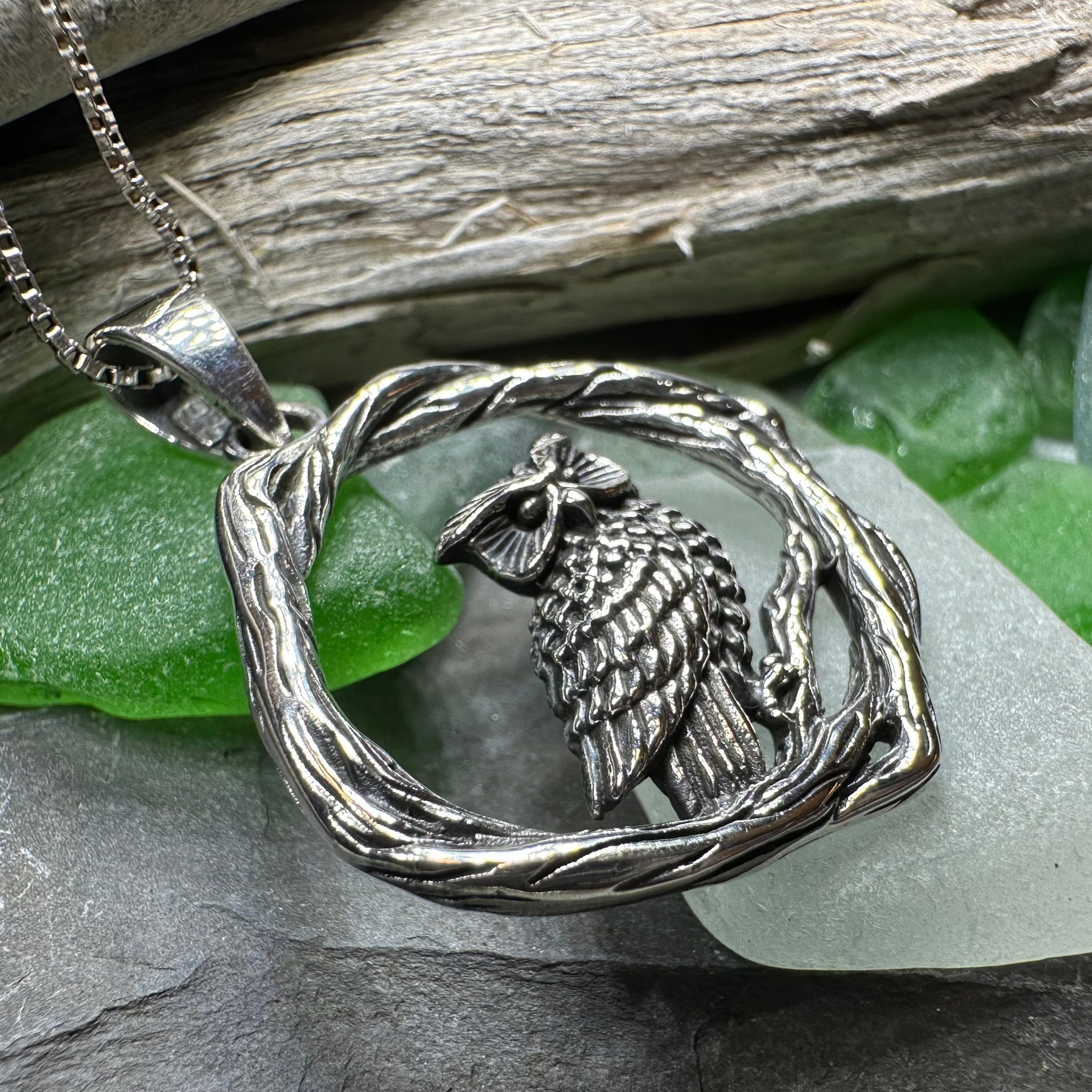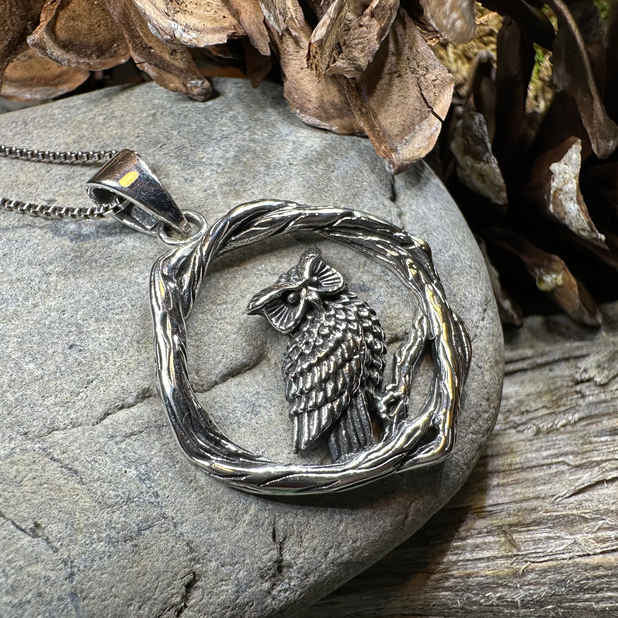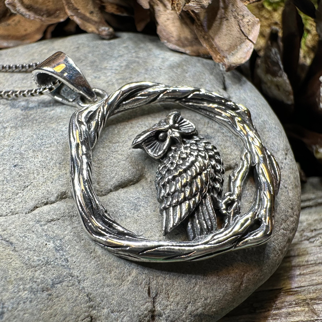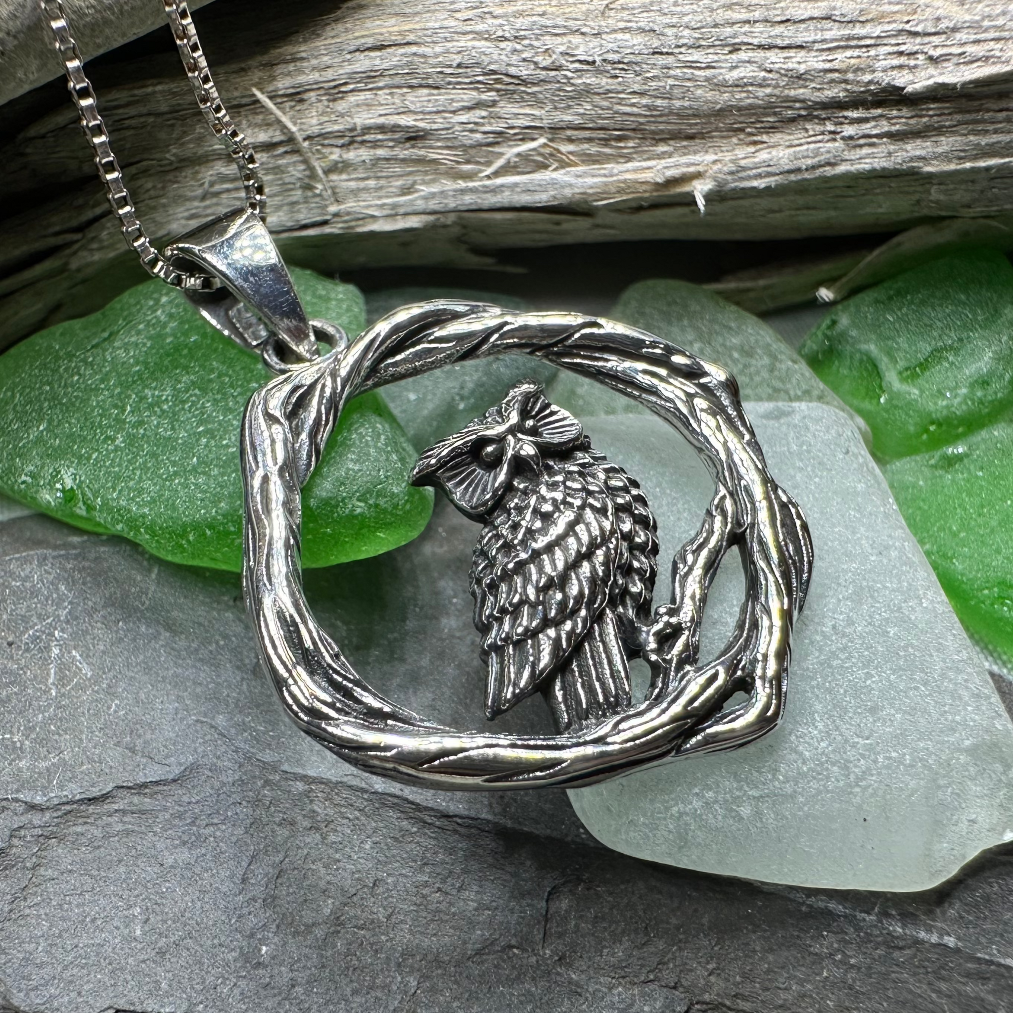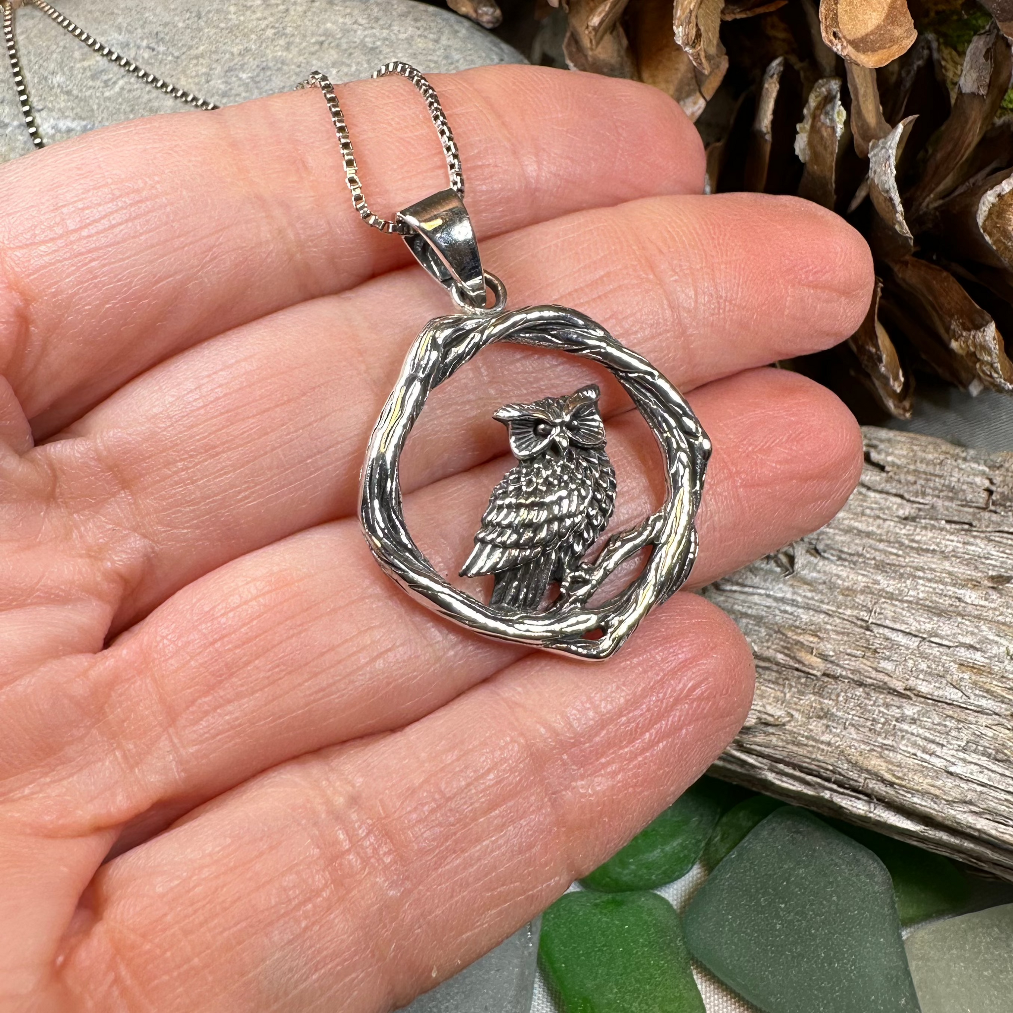 Solid Sterling Silver -- This beautifully detailed Great Horned Owl sits prettily on a circle of ivy - you can see every feather and every detail of the ivy bark.