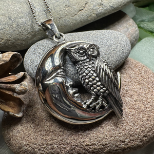 1" x 1" solid sterling silver owl and moon pendant. This lovely pendant comes on an 18" sterling silver chain.