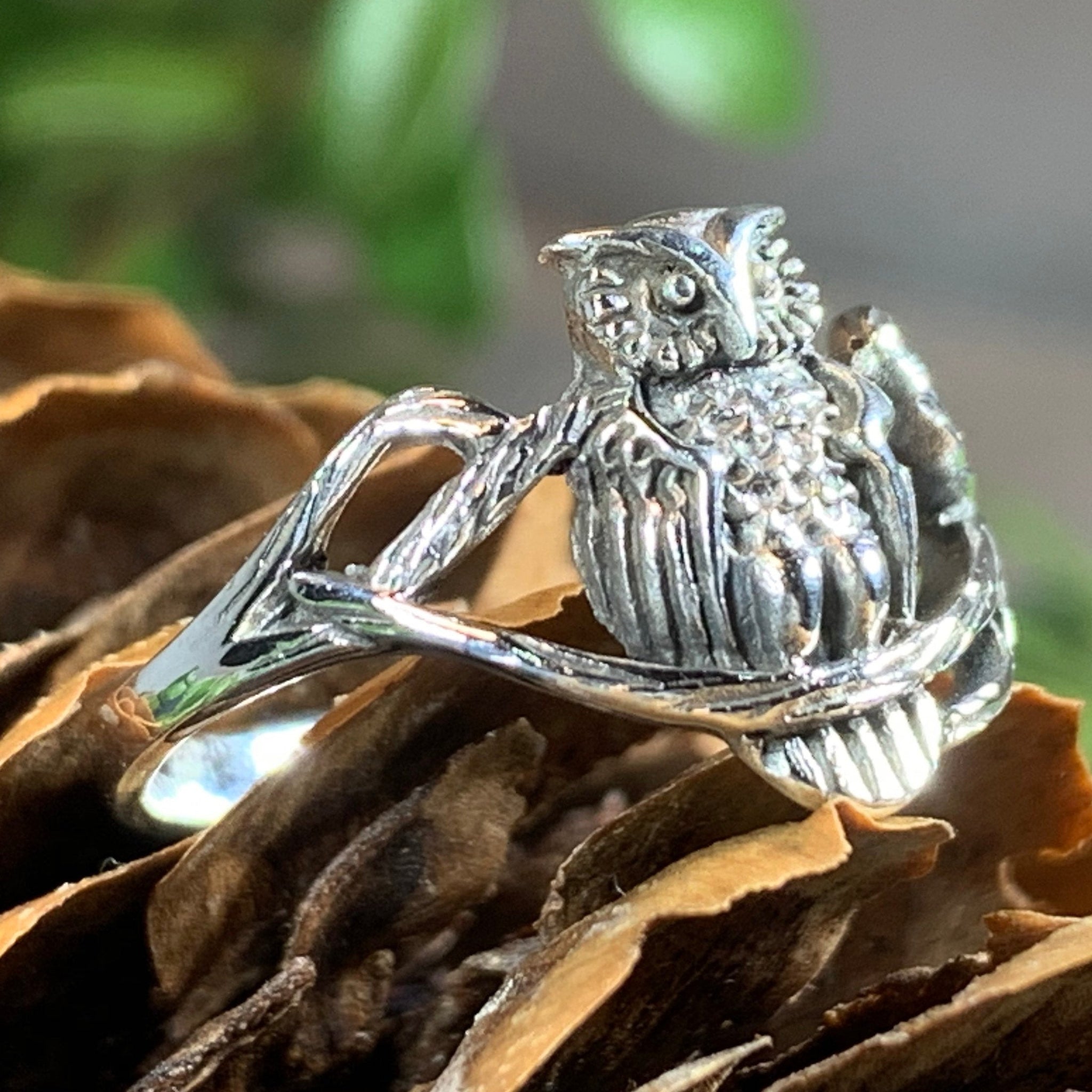 The ring is an artful rendition of an owl - the highly detailed owl is sitting on a tree branch that twists around and becomes the sides of the ring - beautiful!