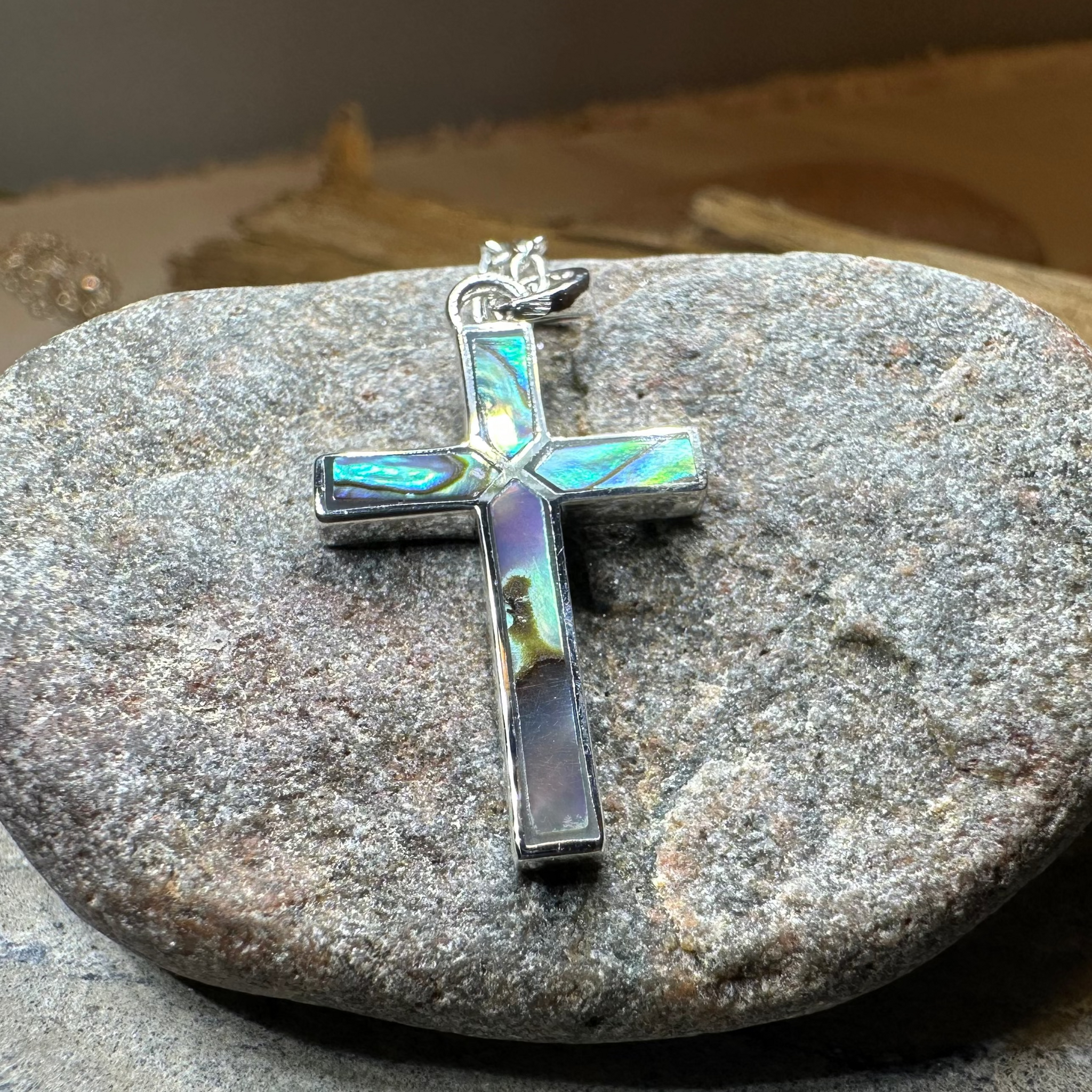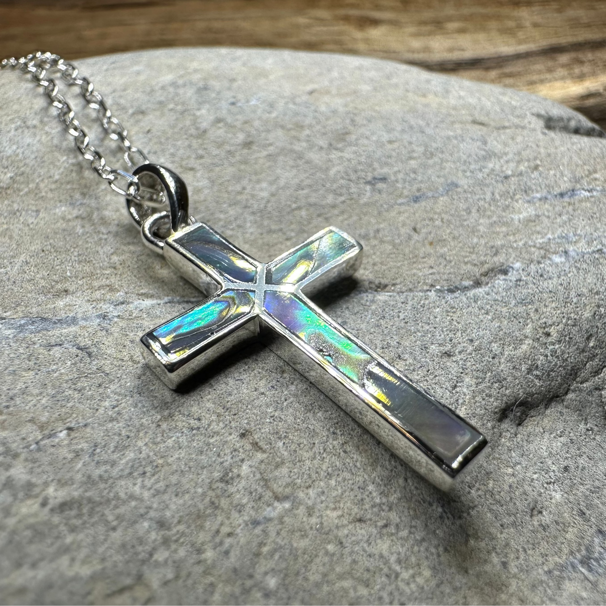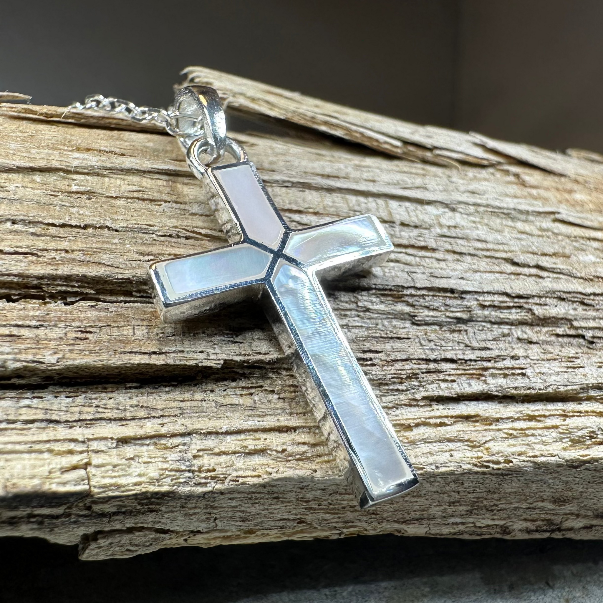 This cross is an elegant, yet simple, Sterling Silver Cross with a traditional design and natural shell inlay.