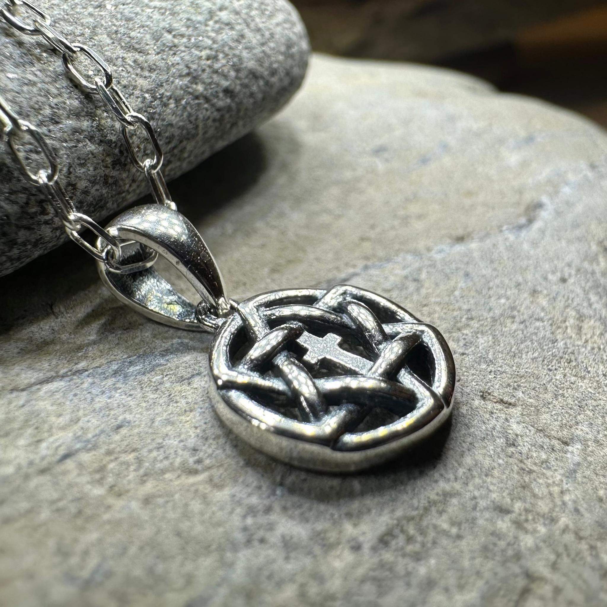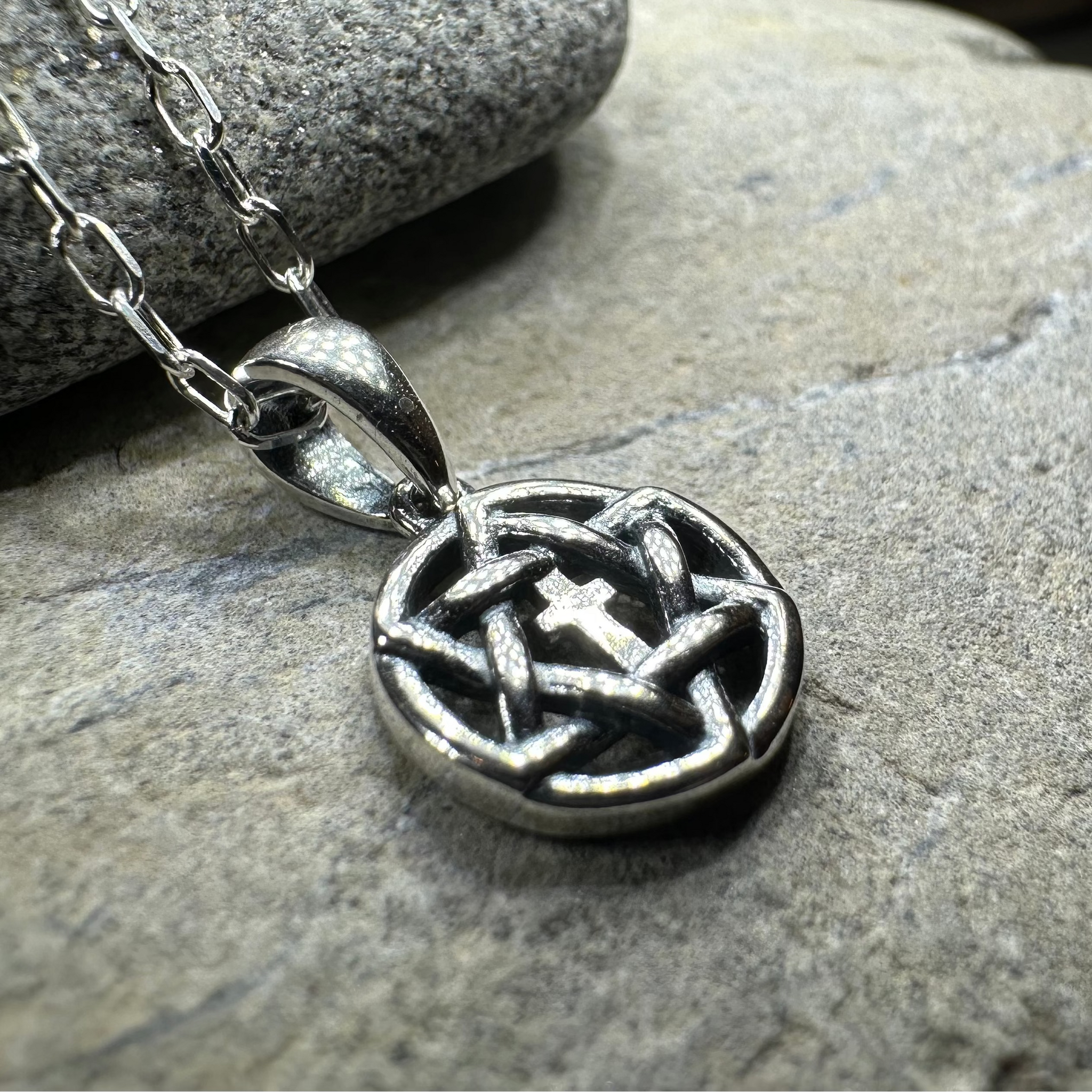 Crafted entirely of 925 sterling silver on an 18" silver chain 1/2" x 1/2" in size.