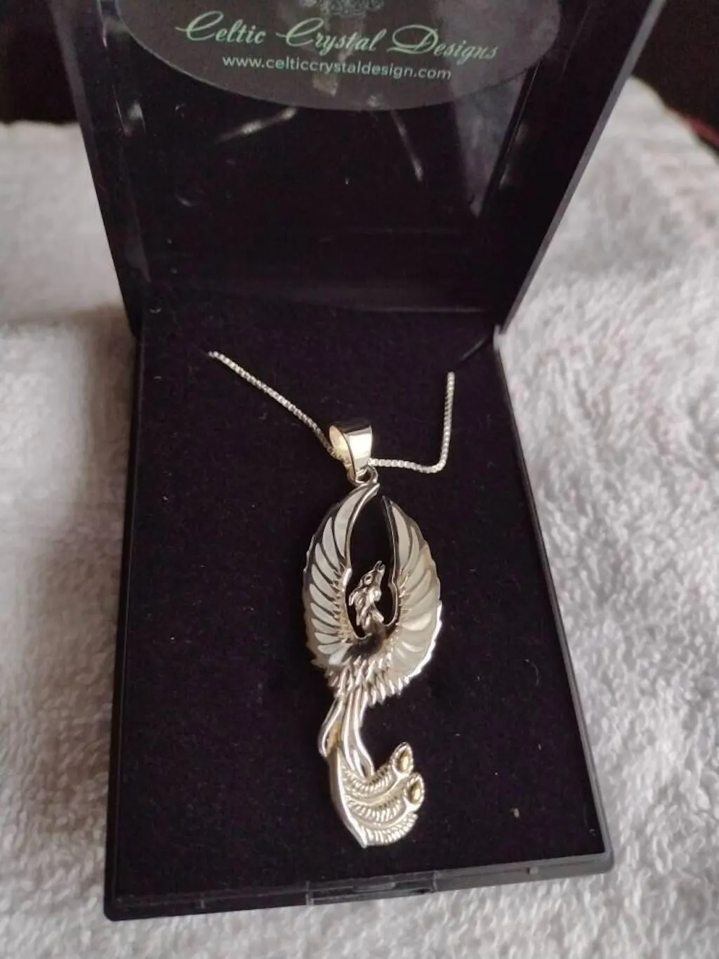 Beautifully detailed necklace in solid sterling silver with 14k detailing on the tail feathers.
