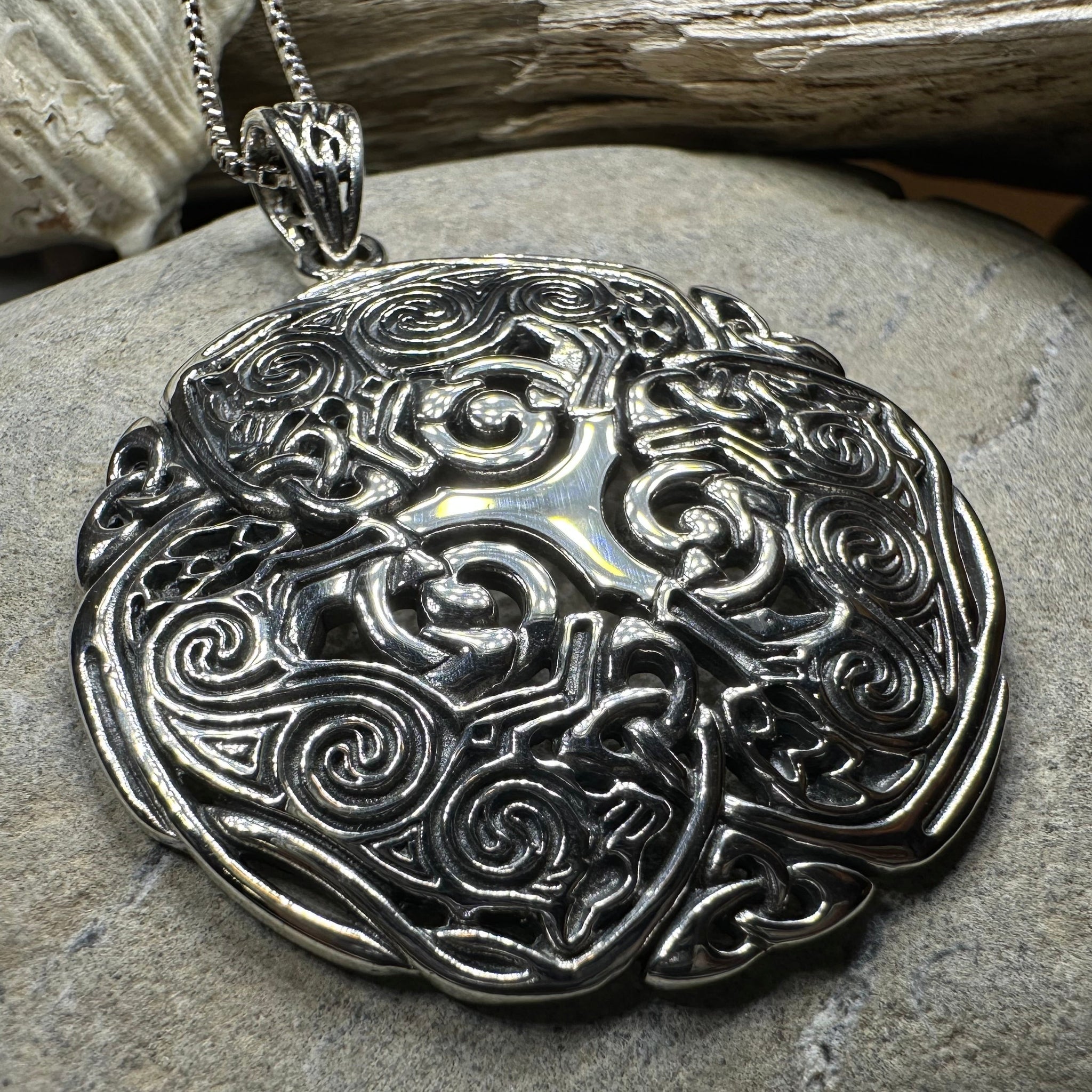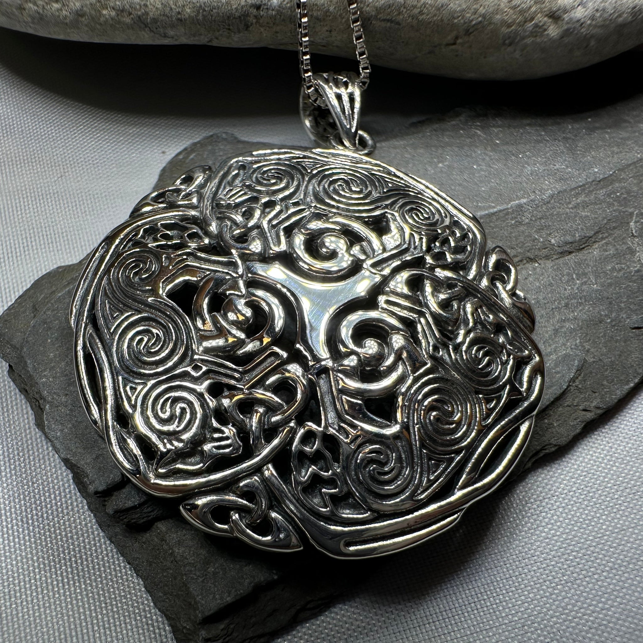 This detailed solid sterling silver Celtic Wolf Spirit will catch the eye. A beautiful design based on Pictish carvings with intricate open Celtic knot work and spirals with three wolvles in a circular design.