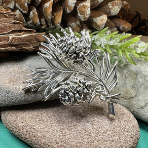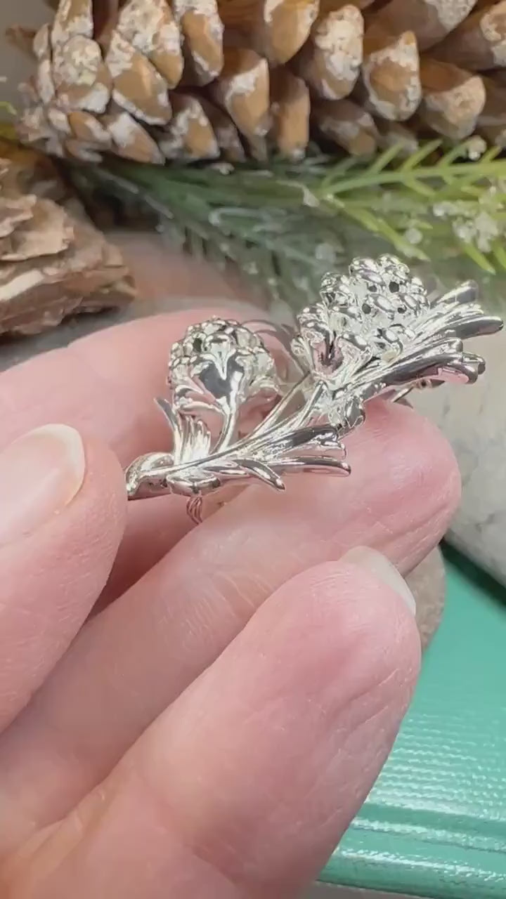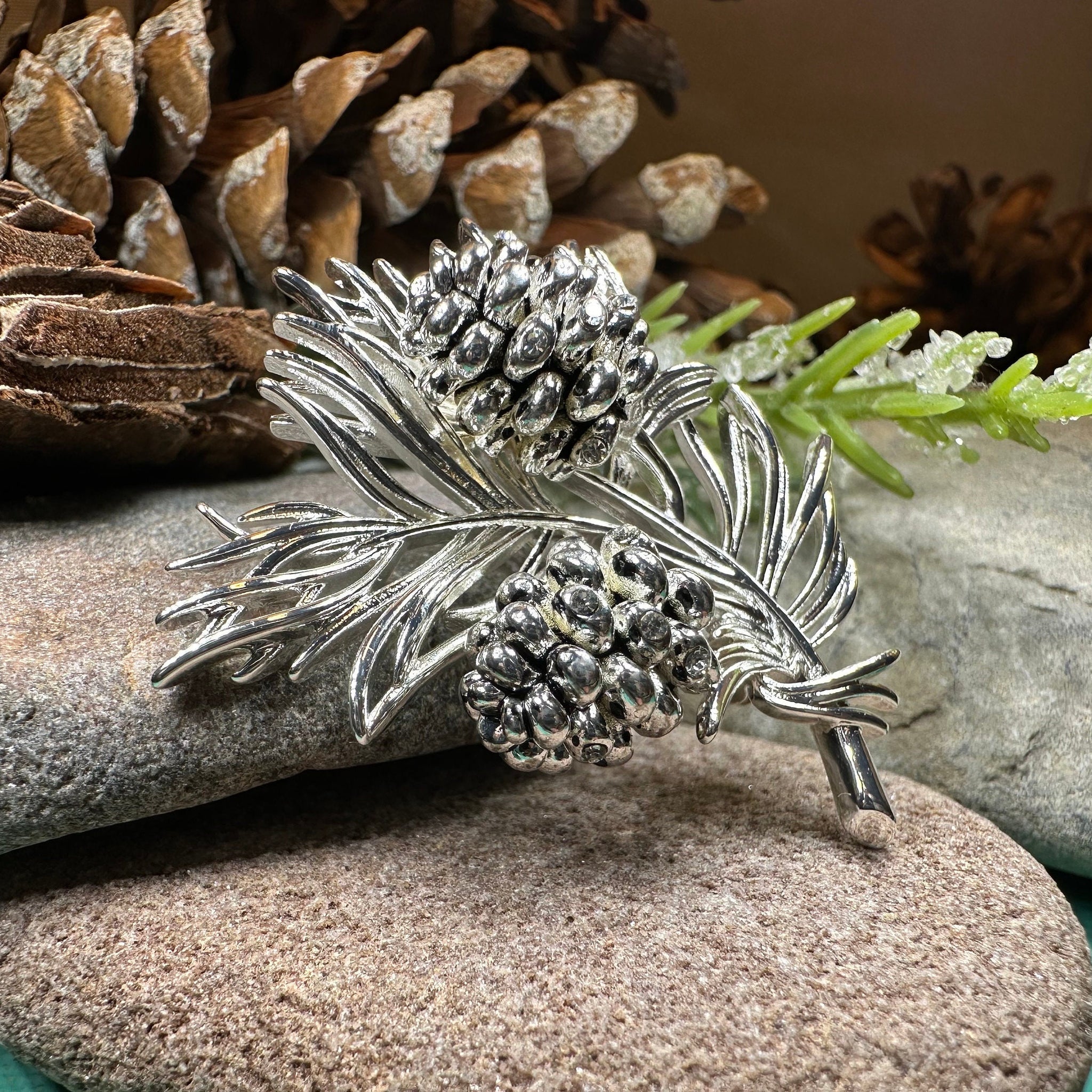 1 1/2" x 1 1/4" sterling silver plated brooch with tiny crystals sparkling in the pine cones..