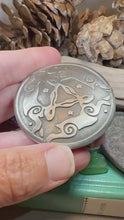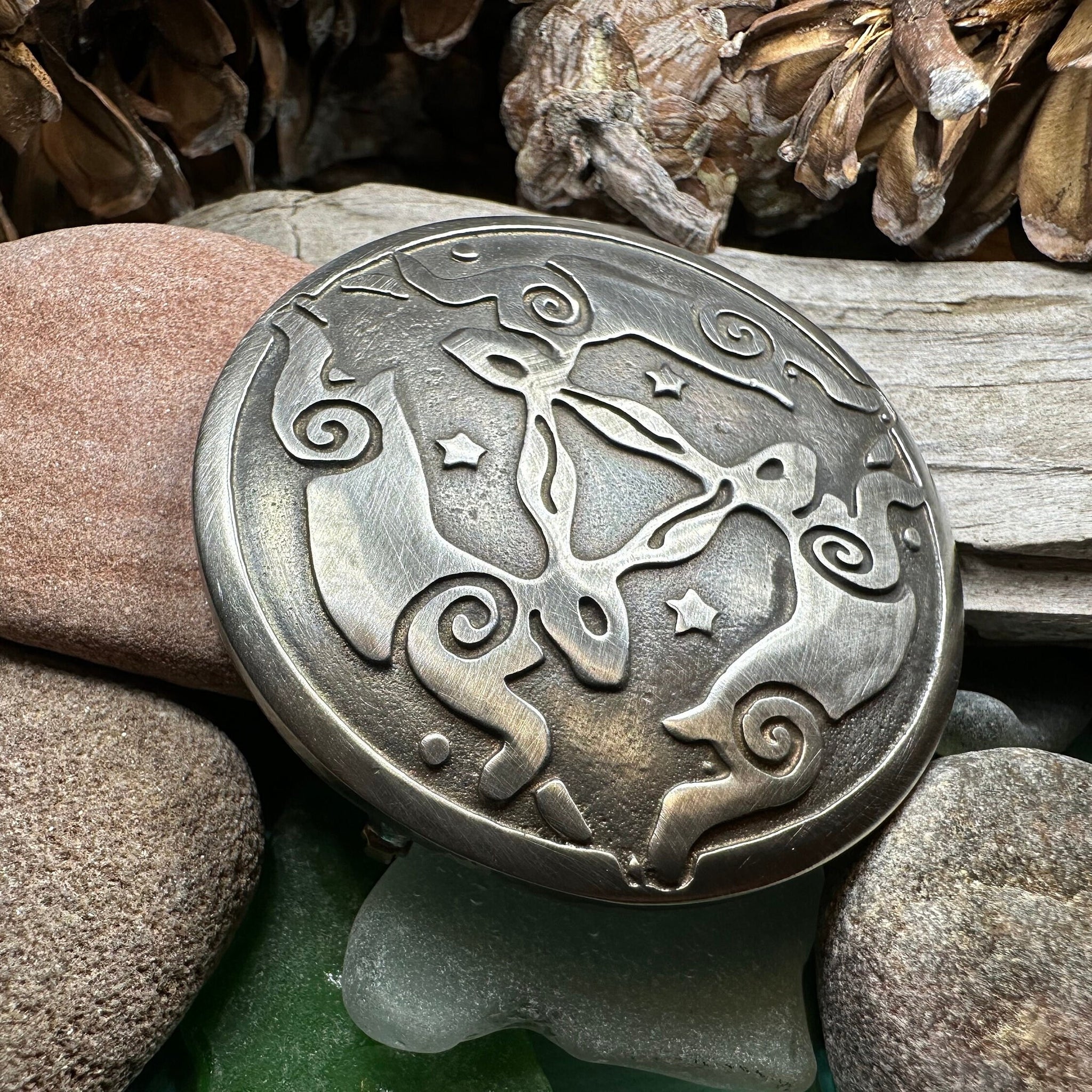 The three hares dance around a sky filled with stars and each hare's body contains a Celtic spiral - the smooth finish of the hares stands up (bas-relief design) with the background textured and oxidized to help the design stand out. The back of the brooch has a 1 3/4" locking pin.