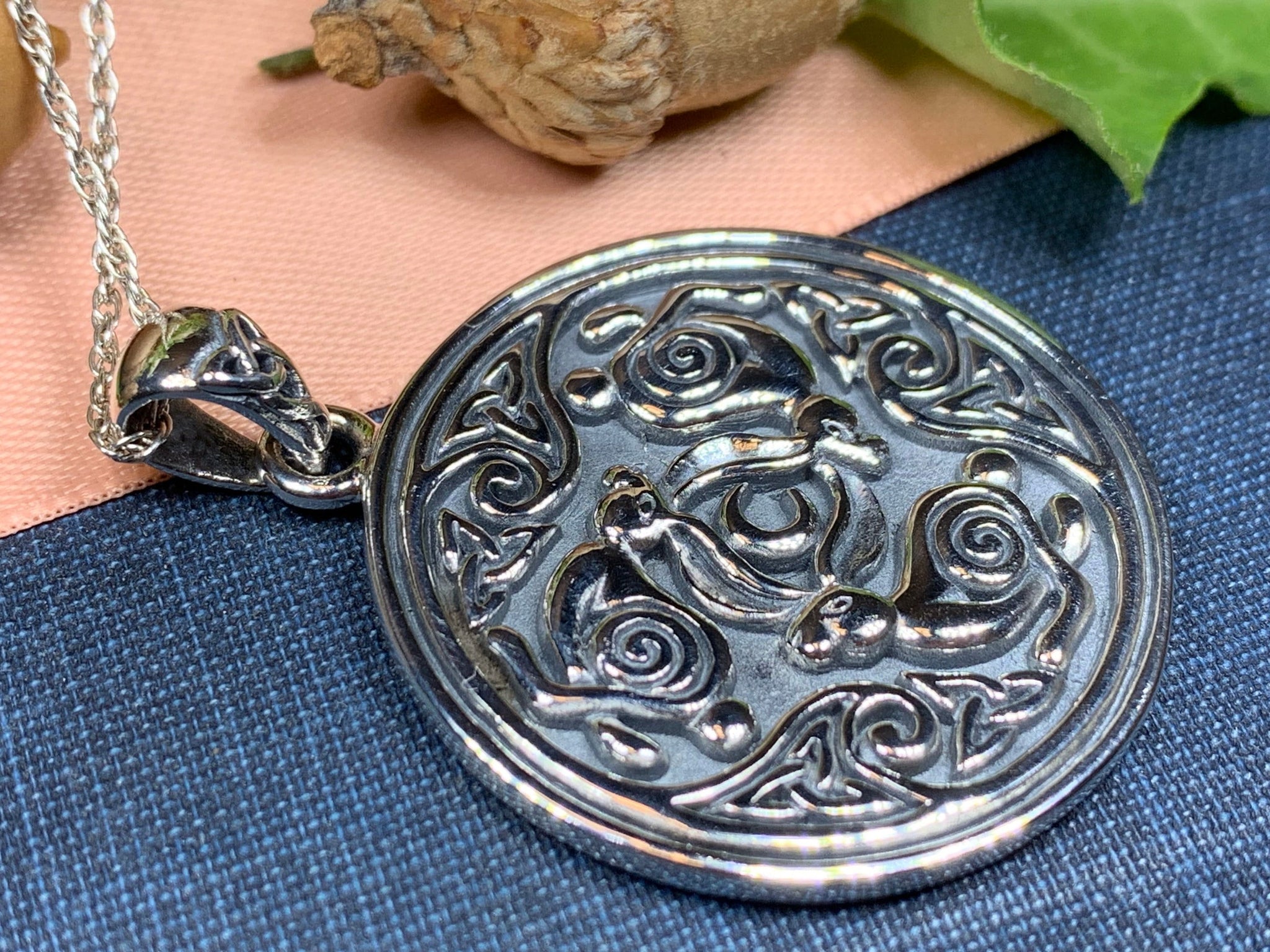 The most beautifully detailed Triple Rabbits necklace in solid sterling silver. We loved creating this extra special design with its elegant design. Intricate Celtic Knot work and celestial moons create a unique piece that celebrates Celtic culture and nature.