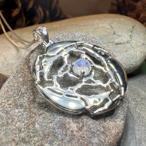 Beautifully detailed necklace in solid sterling silver with an authentic rainbow moonstone center.