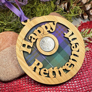A fantastic Scottish themed gift! This engraved "Happy Retirement" hanging wooden plaque with a lucky sixpence in the centre is a fantastic memorable gift!