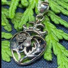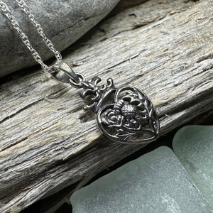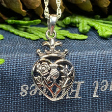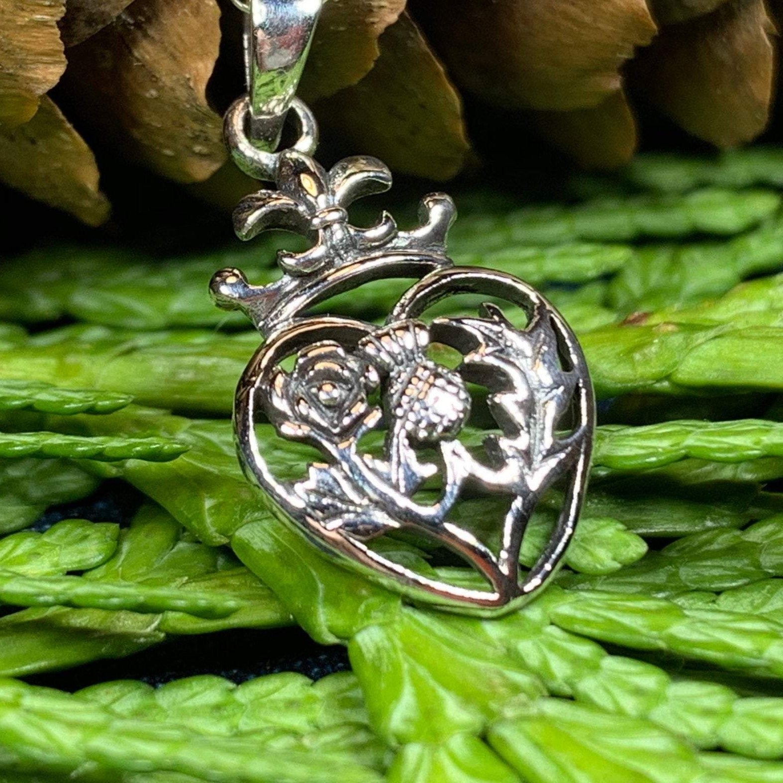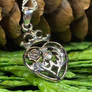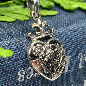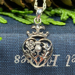 A highly attractive Luckenbooth Sterling Silver Pendant, with a design based on the romantic life of Mary Queen of Scots. The beautiful crowned heart has the thistle and rose at its center - a beautiful design.