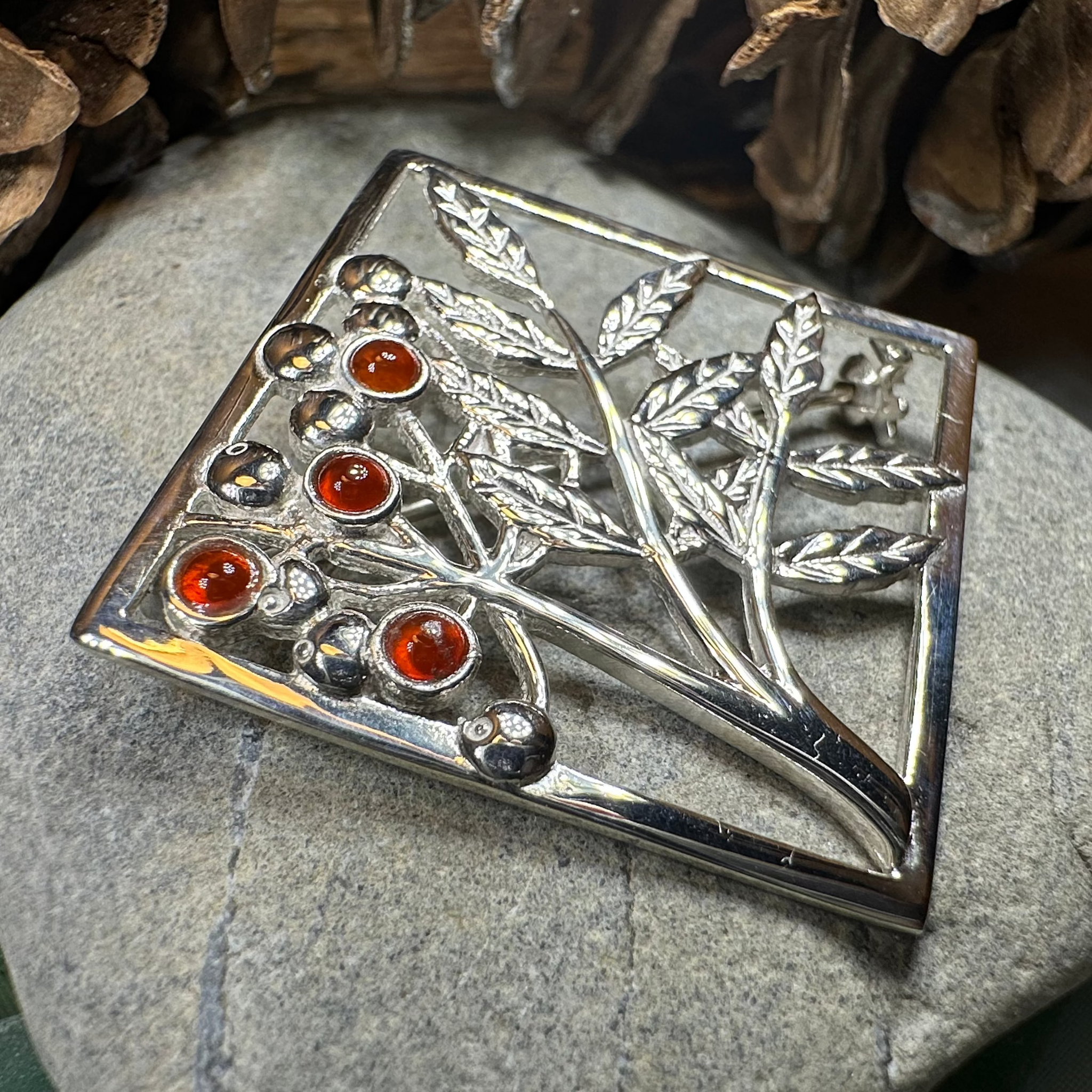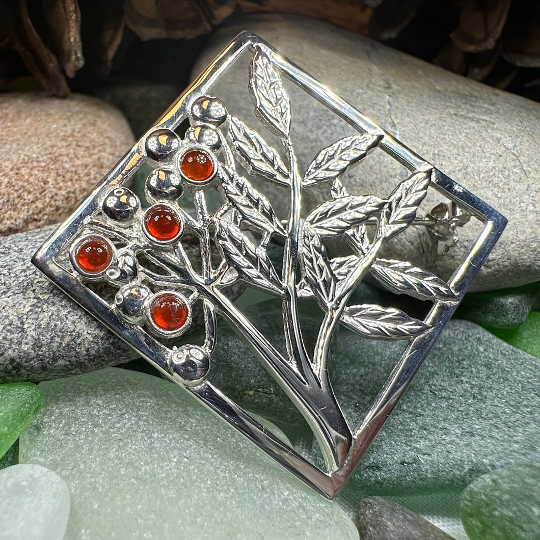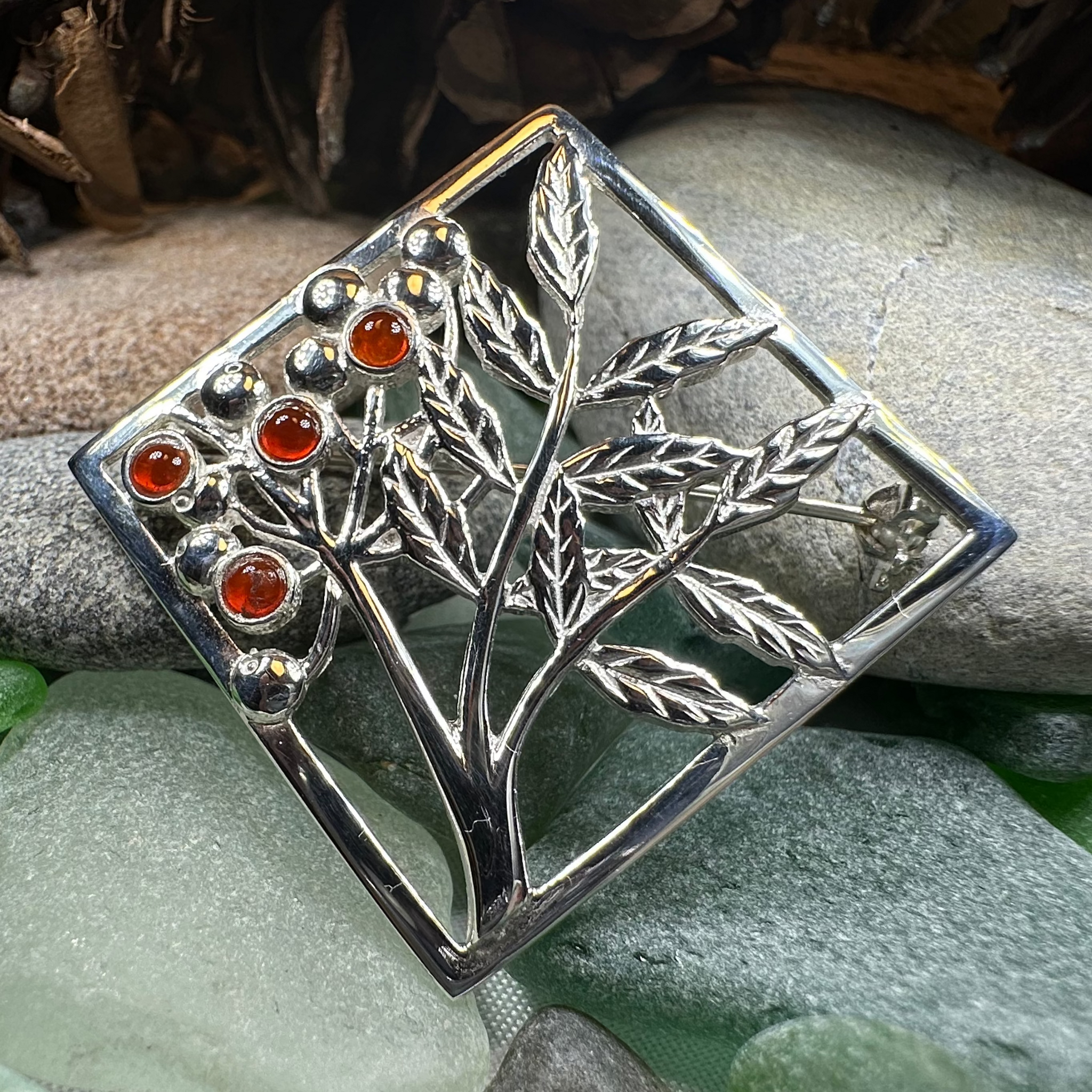 This sterling silver brooch is adorned with red carnelian "berries" to create the majestic beauty of this mystical tree - known as the Goddess Tree! The Rowan tree has a long, sacred history.