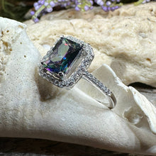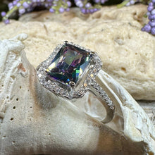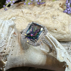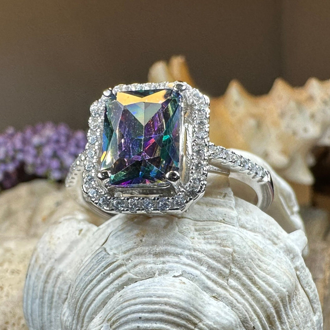 The traditional elements of the classic ladies ring with a large glowing mystic topaz and 40 diamond zirconia accent stones - sterling silver with a blue-green mystic topaz.