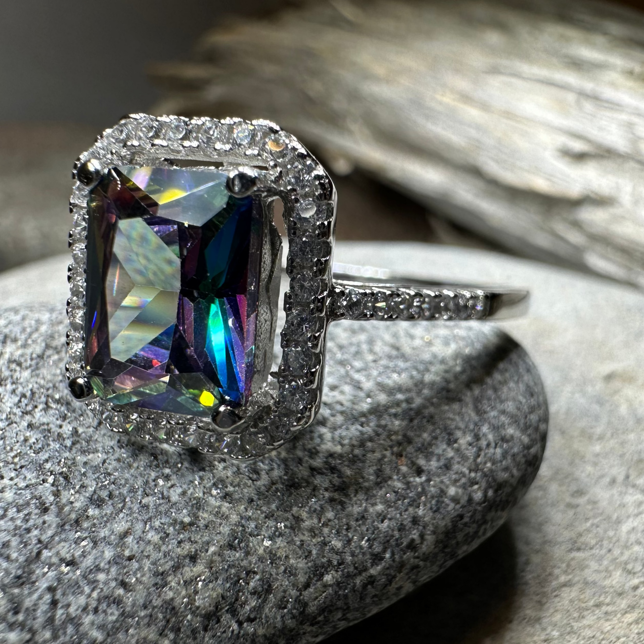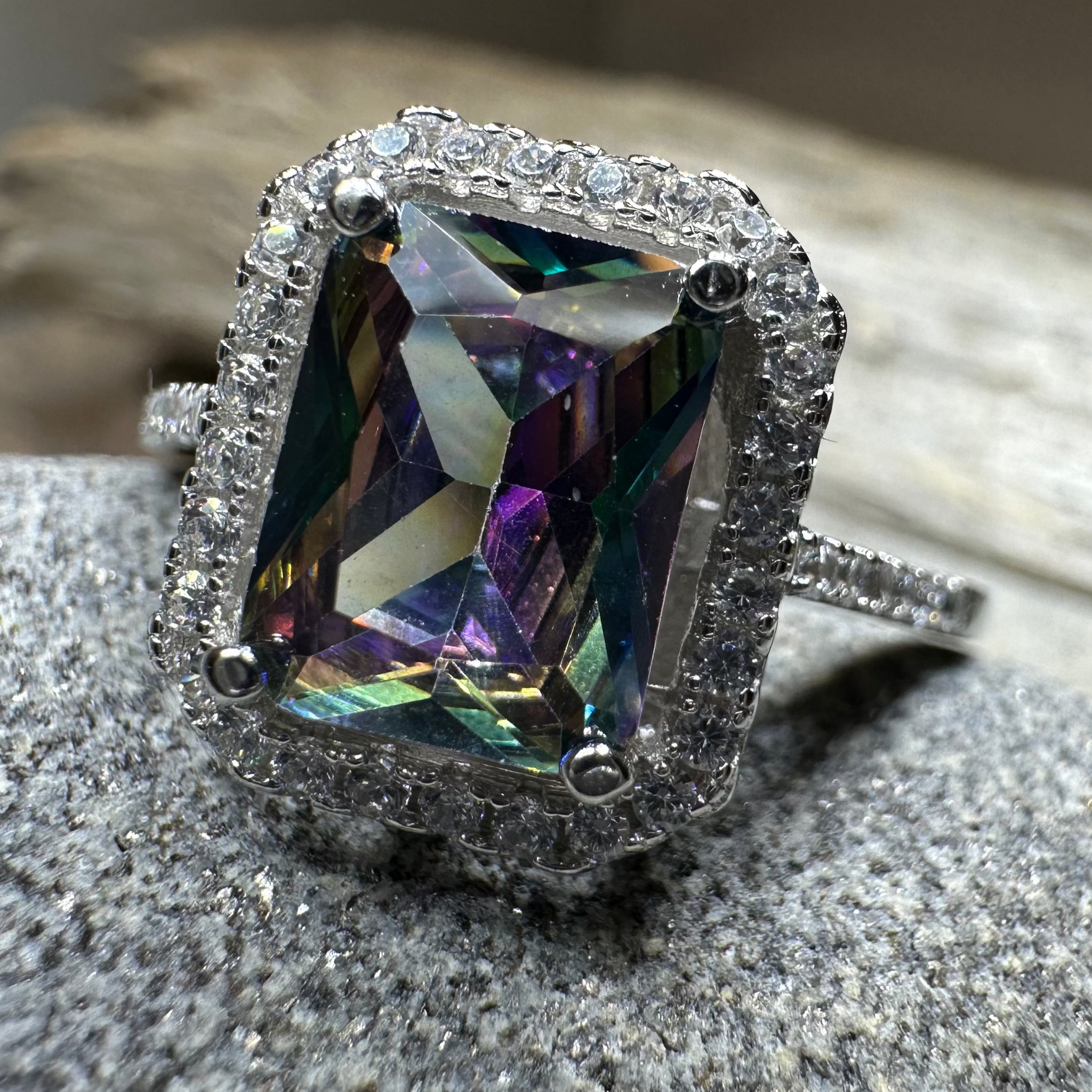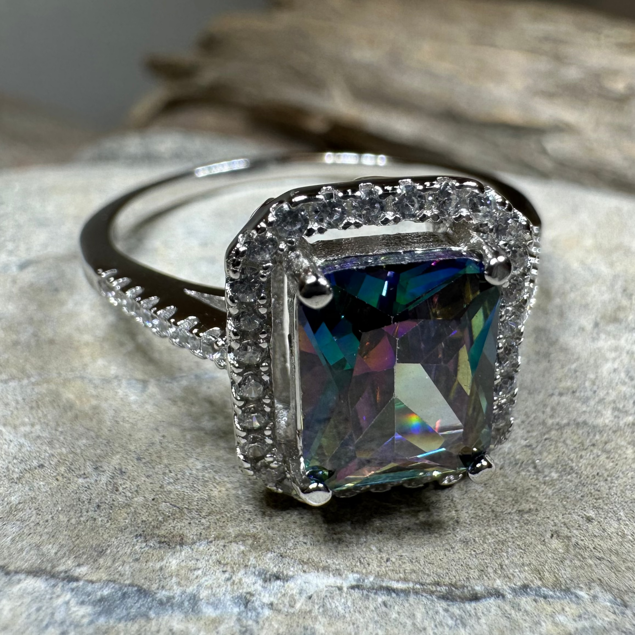 The traditional elements of the classic ladies ring with a large glowing mystic topaz and 40 diamond zirconia accent stones - sterling silver with a blue-green mystic topaz.