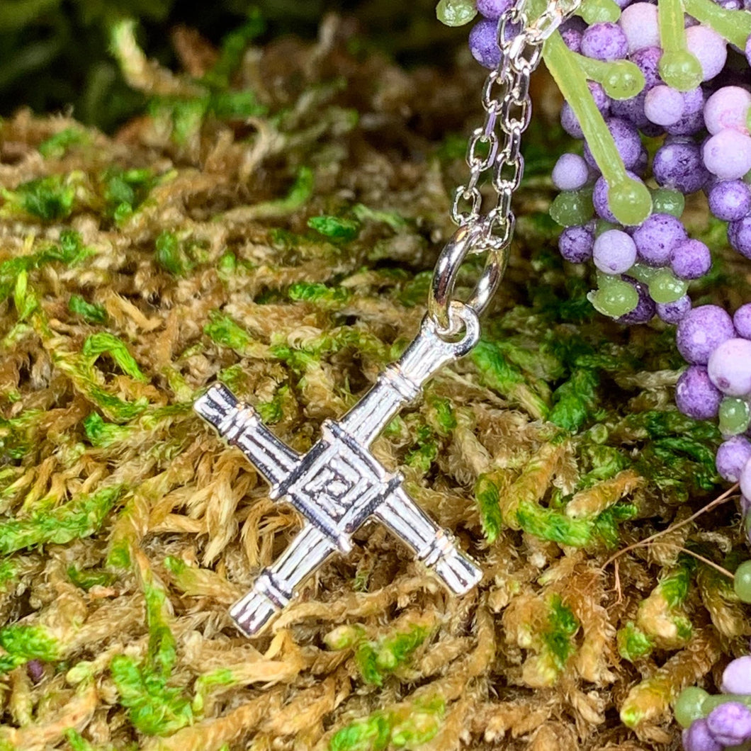 A solid sterling silver petite cross with beautiful detailing on both sides of the pendant. A lovely tribute to Ireland and faith.