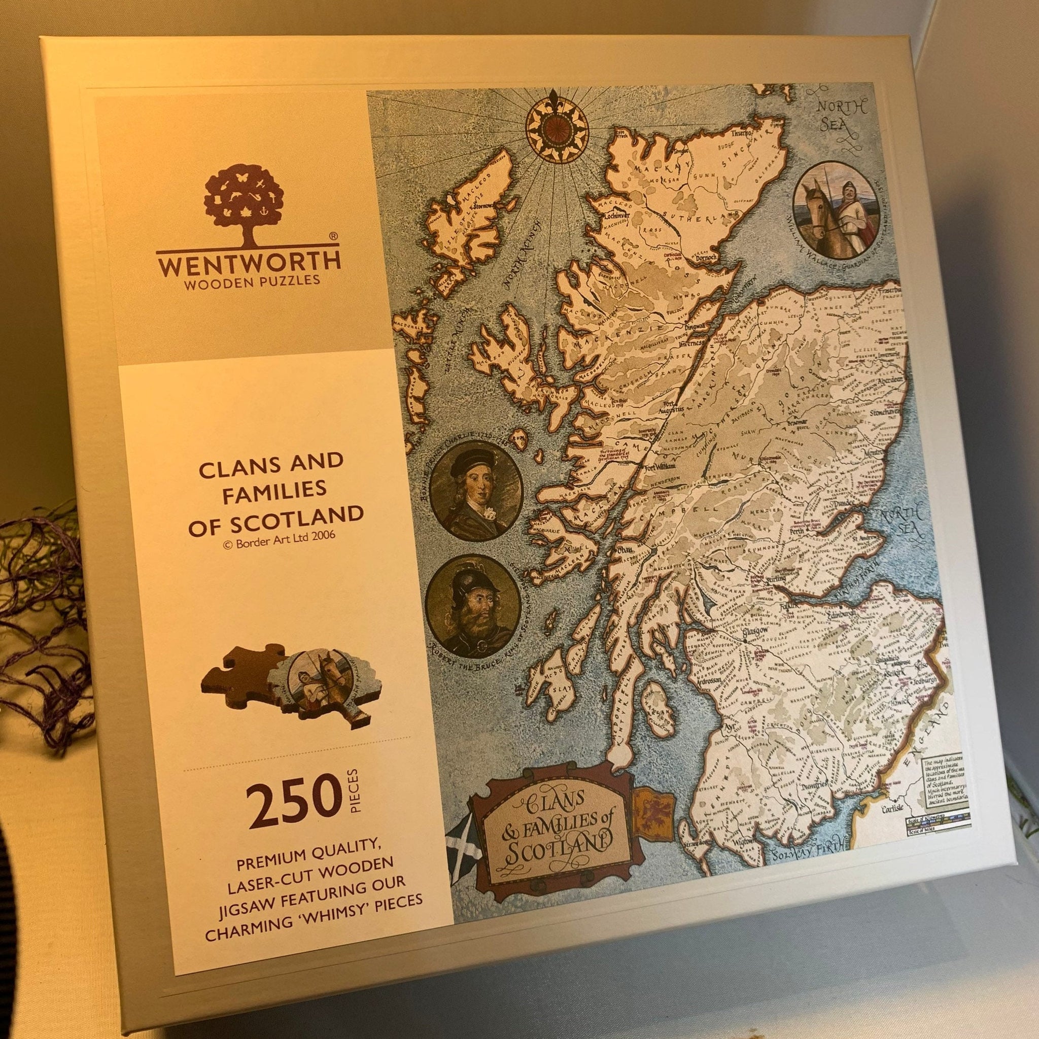 Premium laser cut wooden jigsaw featuring charming whimsy pieces showing the mapy of Scotland that shows where the various clans come from and portraits of famous people Scottish history, including Robert the Bruce, the Bonnie Prince and William Wallace.